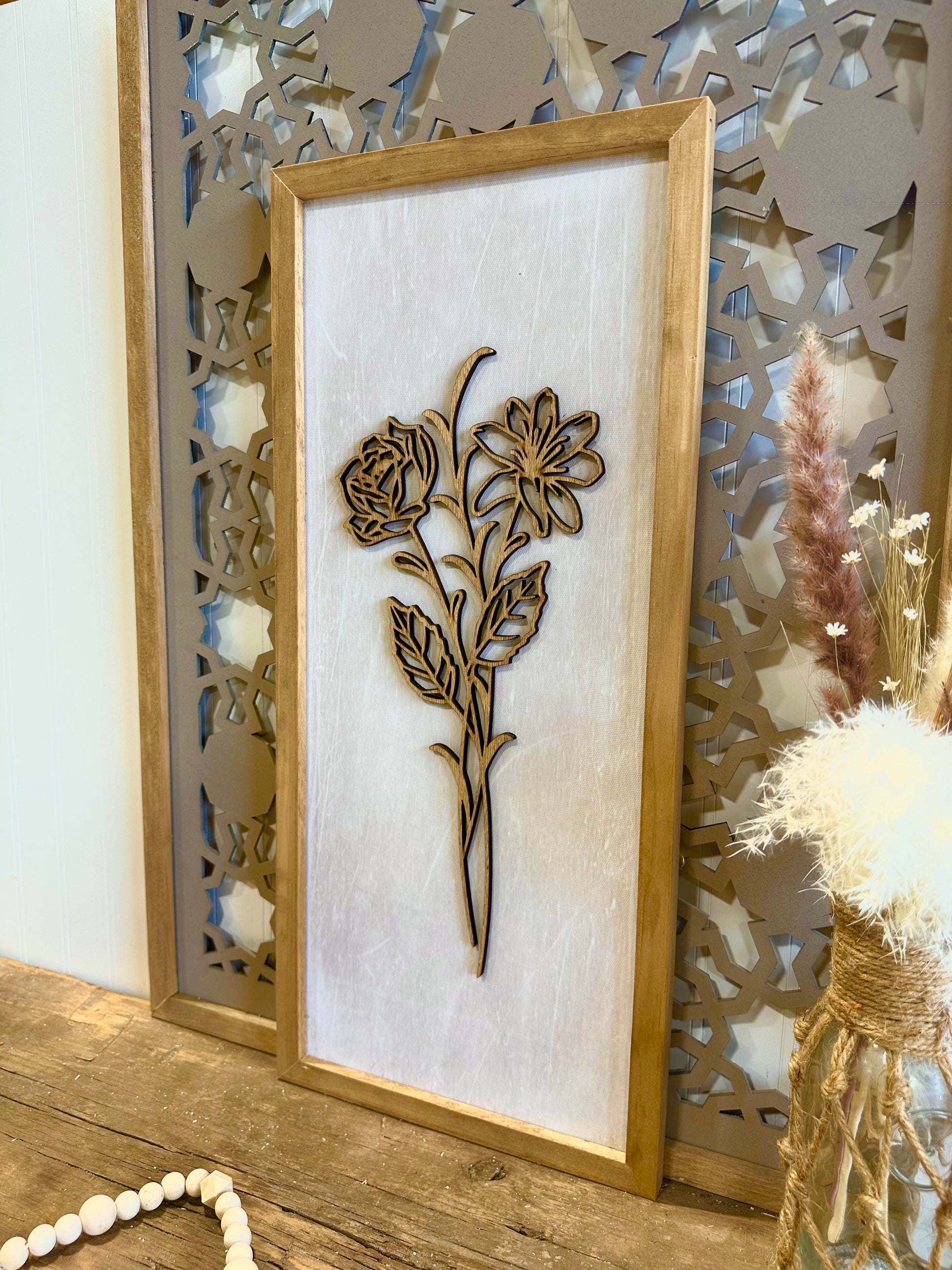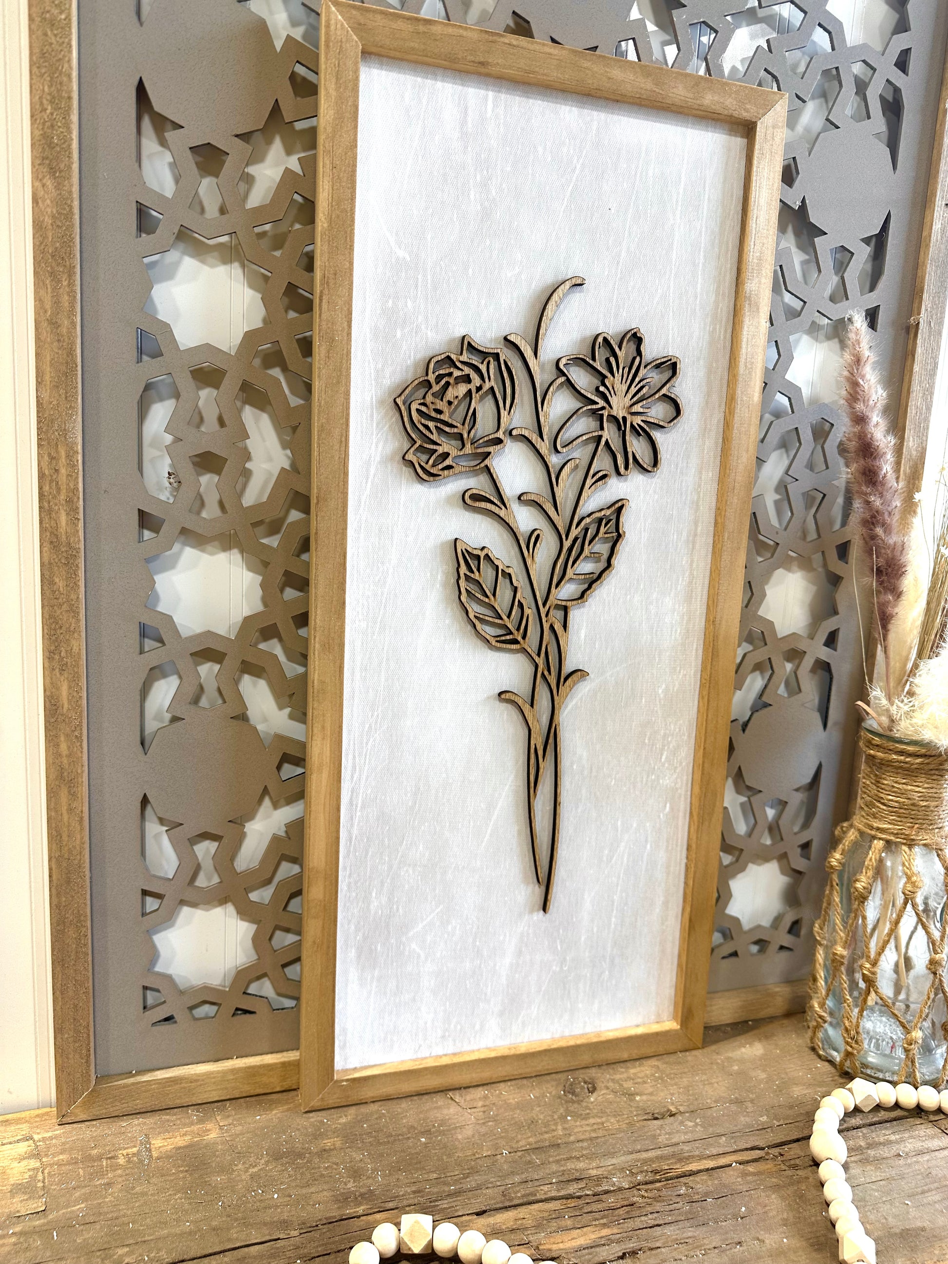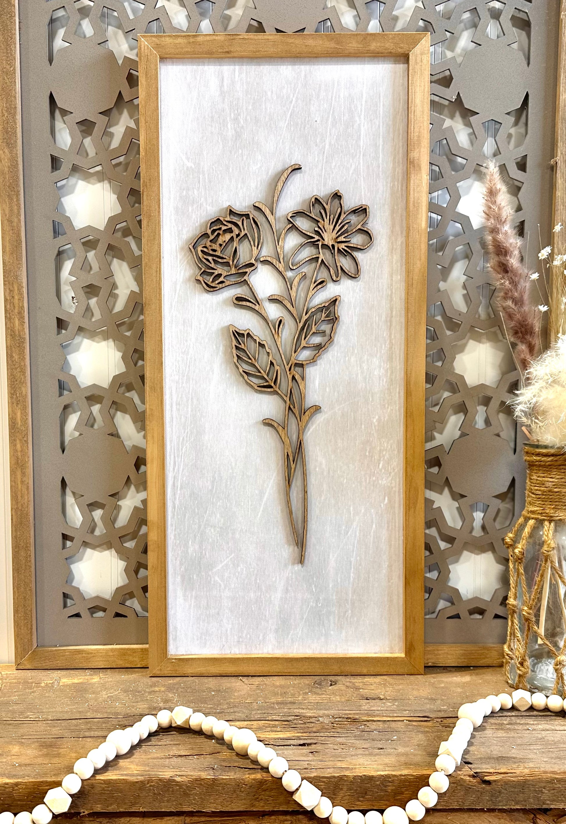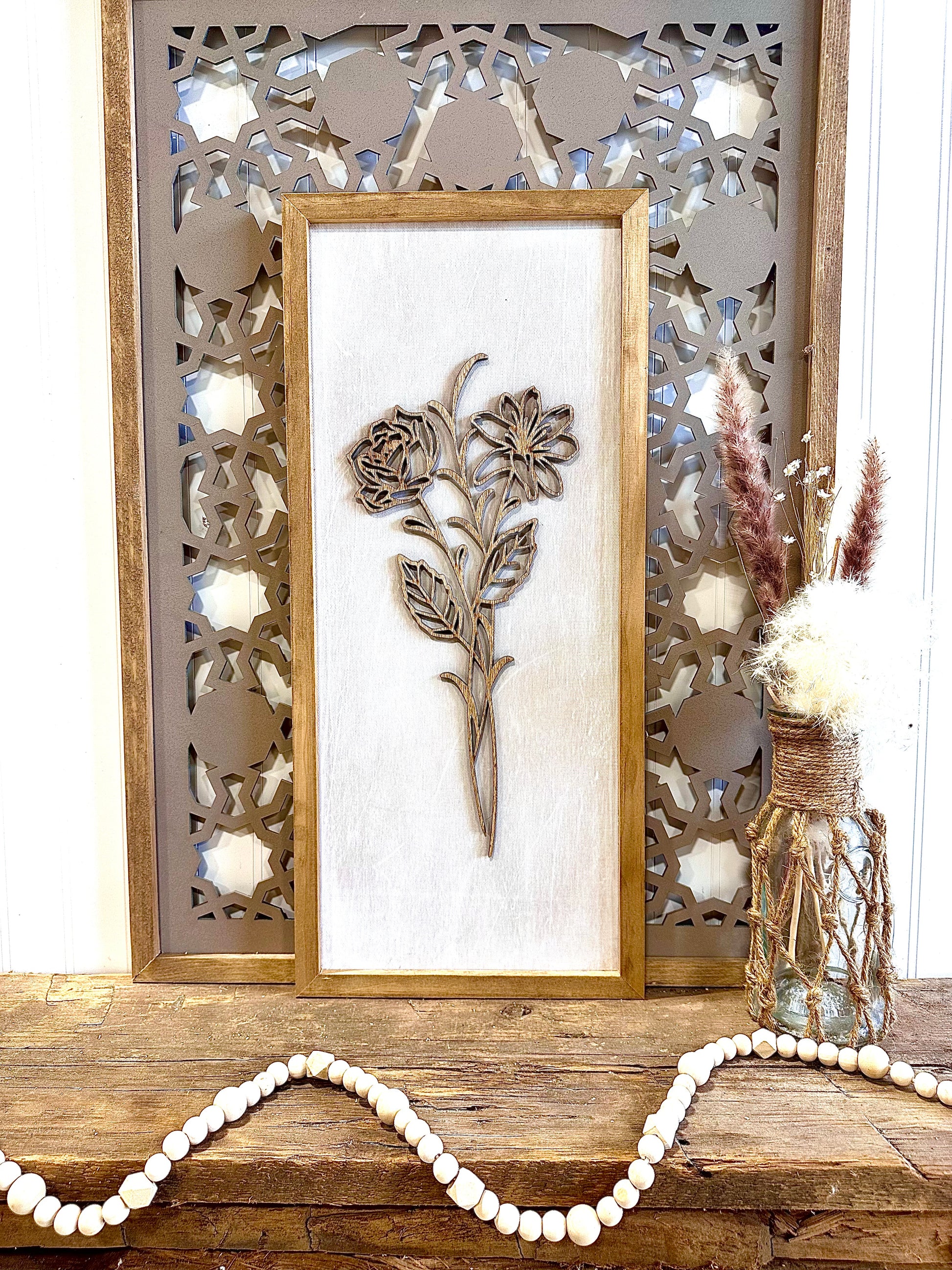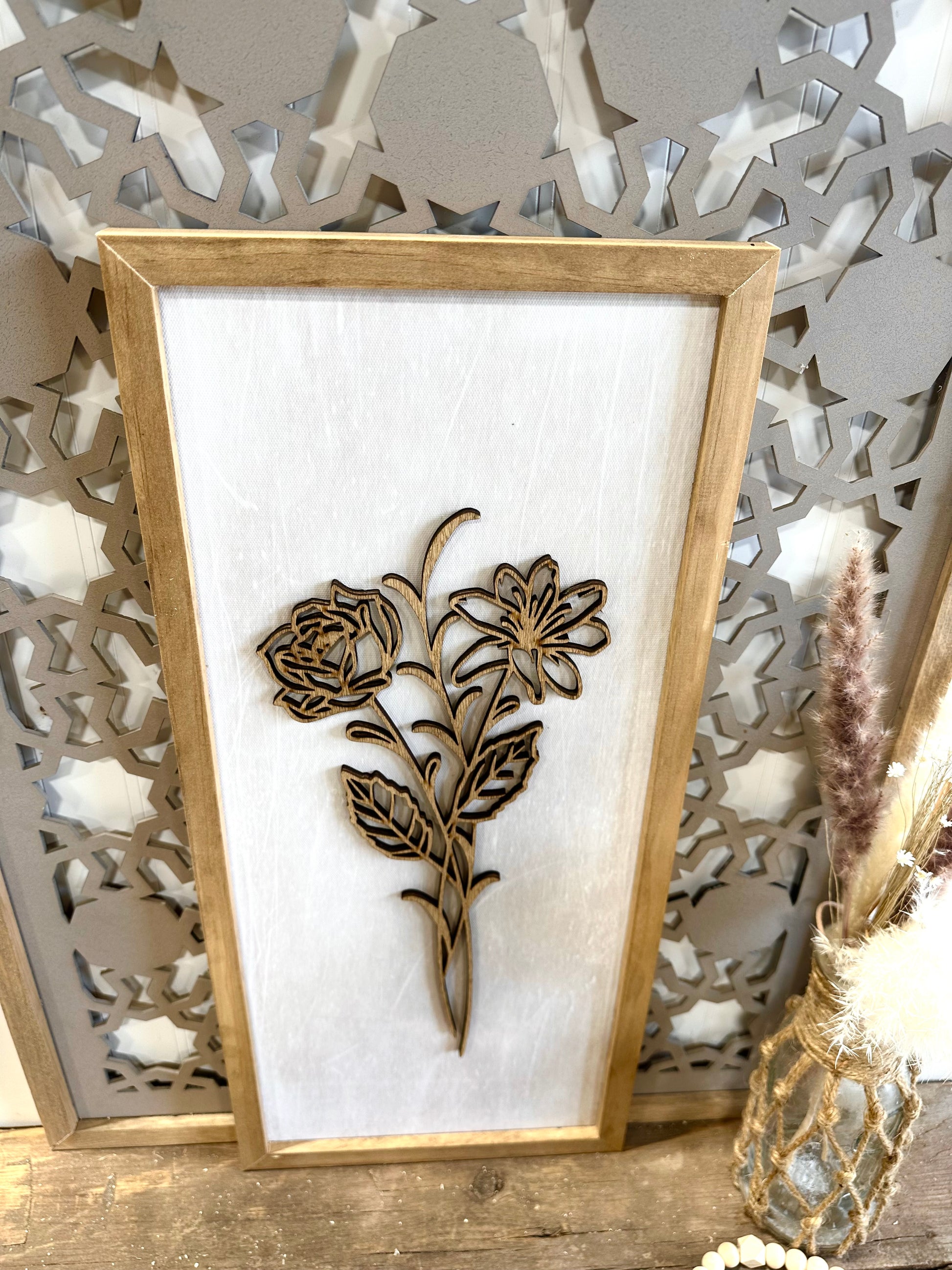 wood flower is laser cut, giving a 3D effect and adhered to the canvas backer.