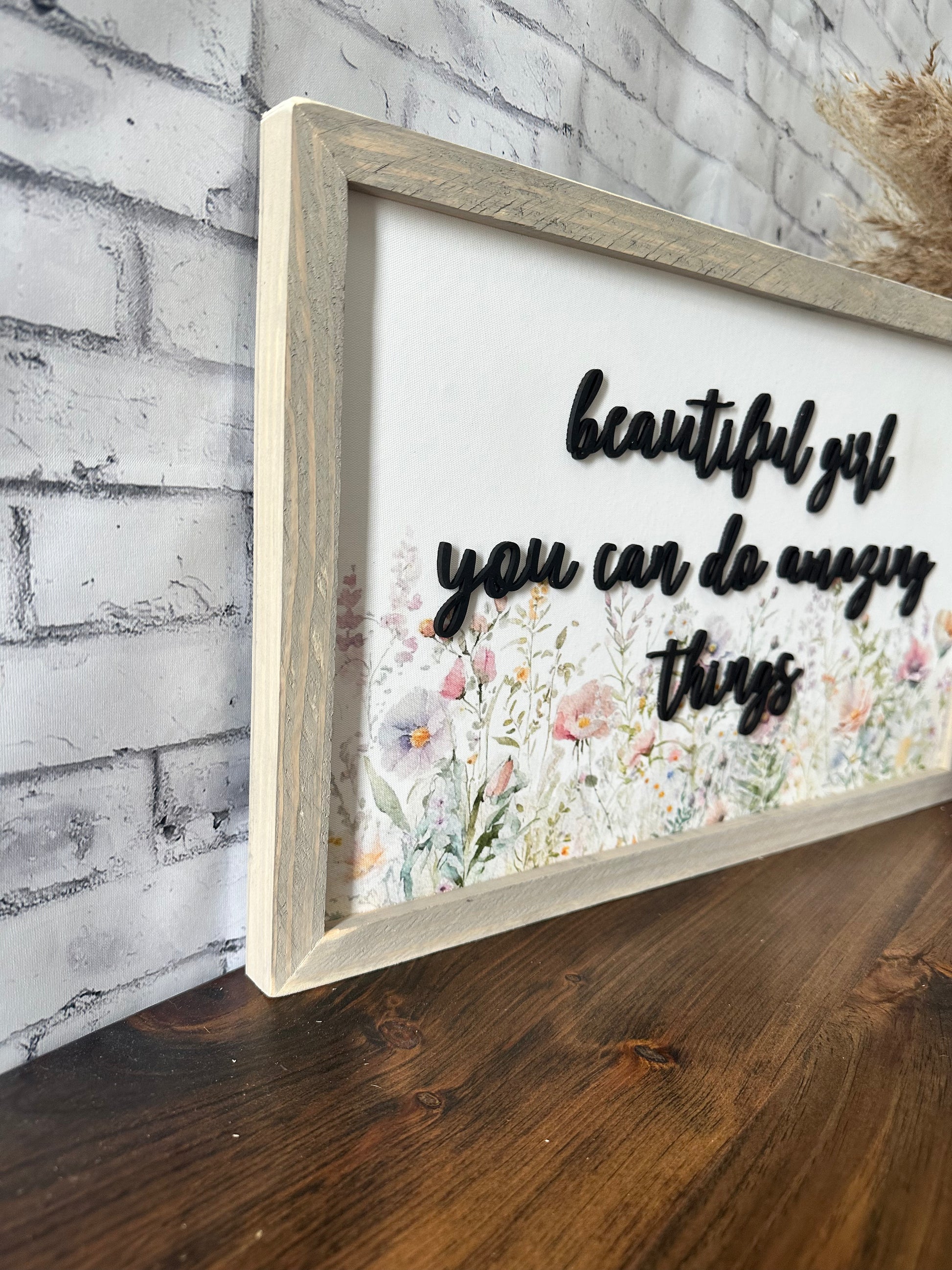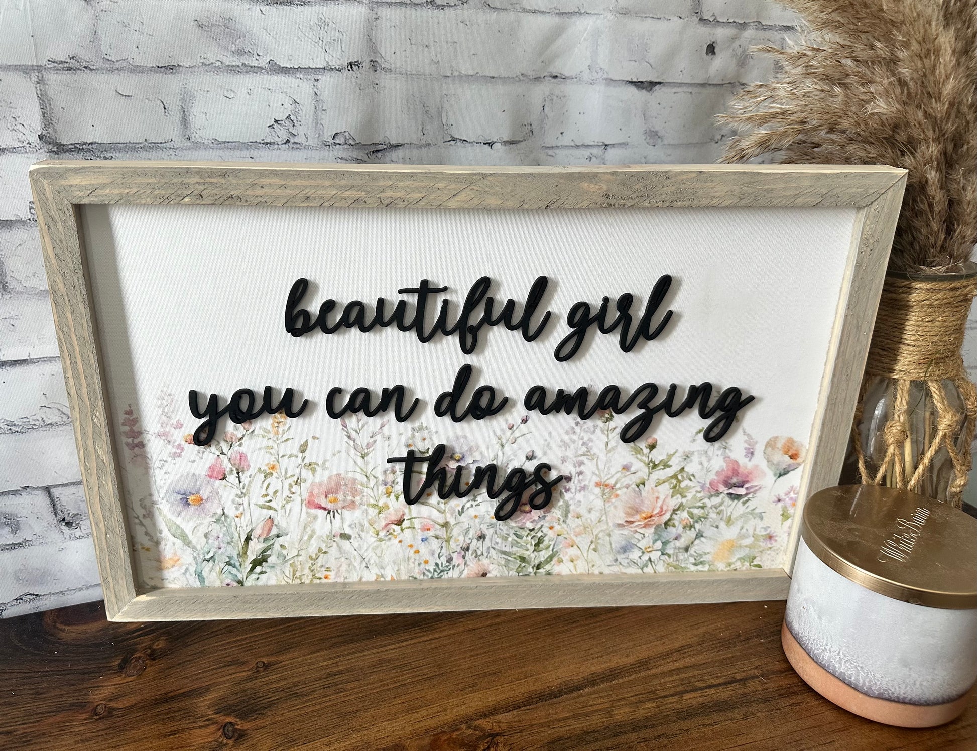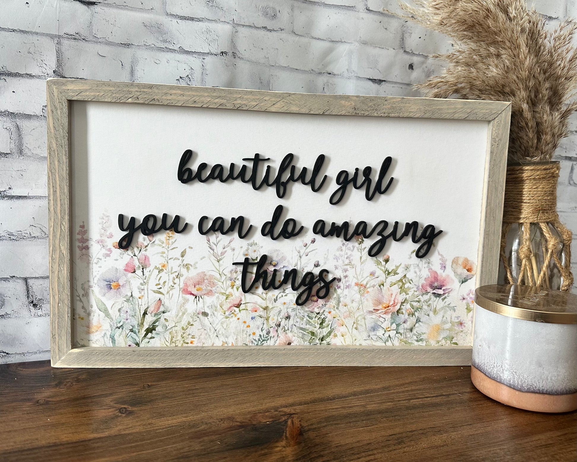 Each of our signs are framed in a 1inch thick frame, and edges are mitered. the sign backer sits in the center of the frame and a sawtooth hanger is attached to the back of the sign for easy hanging. All of our signs are made from wood and MDF. Each or our signs are handmade here in our home-based studio, therefore no two signs will be exactly the same. We believe this gives our products a unique touch. Please keep in mind that our products are wood based therefore there may be slight imperfections such as wood grain and knots, though we strive to use the best quality materials.
