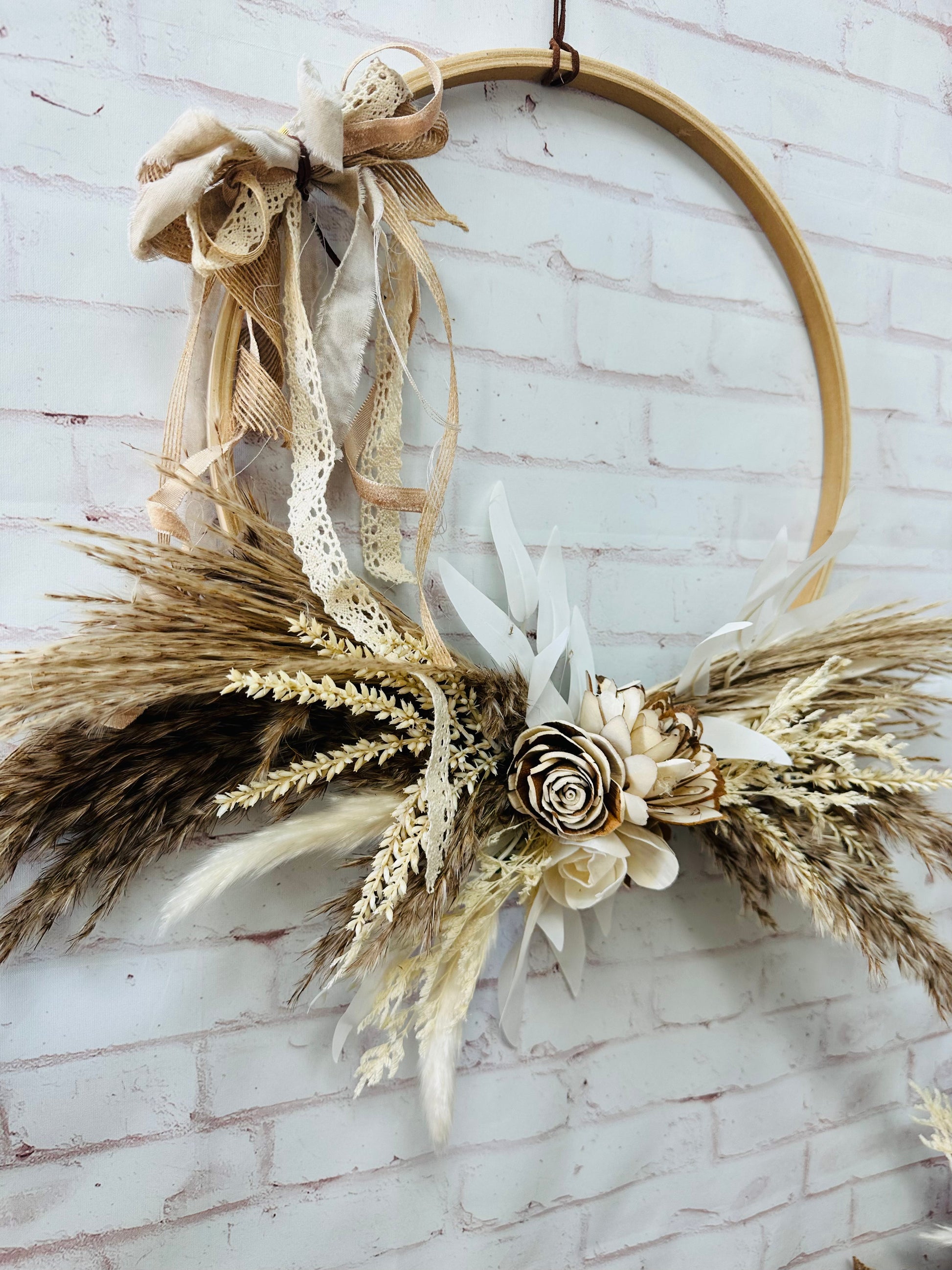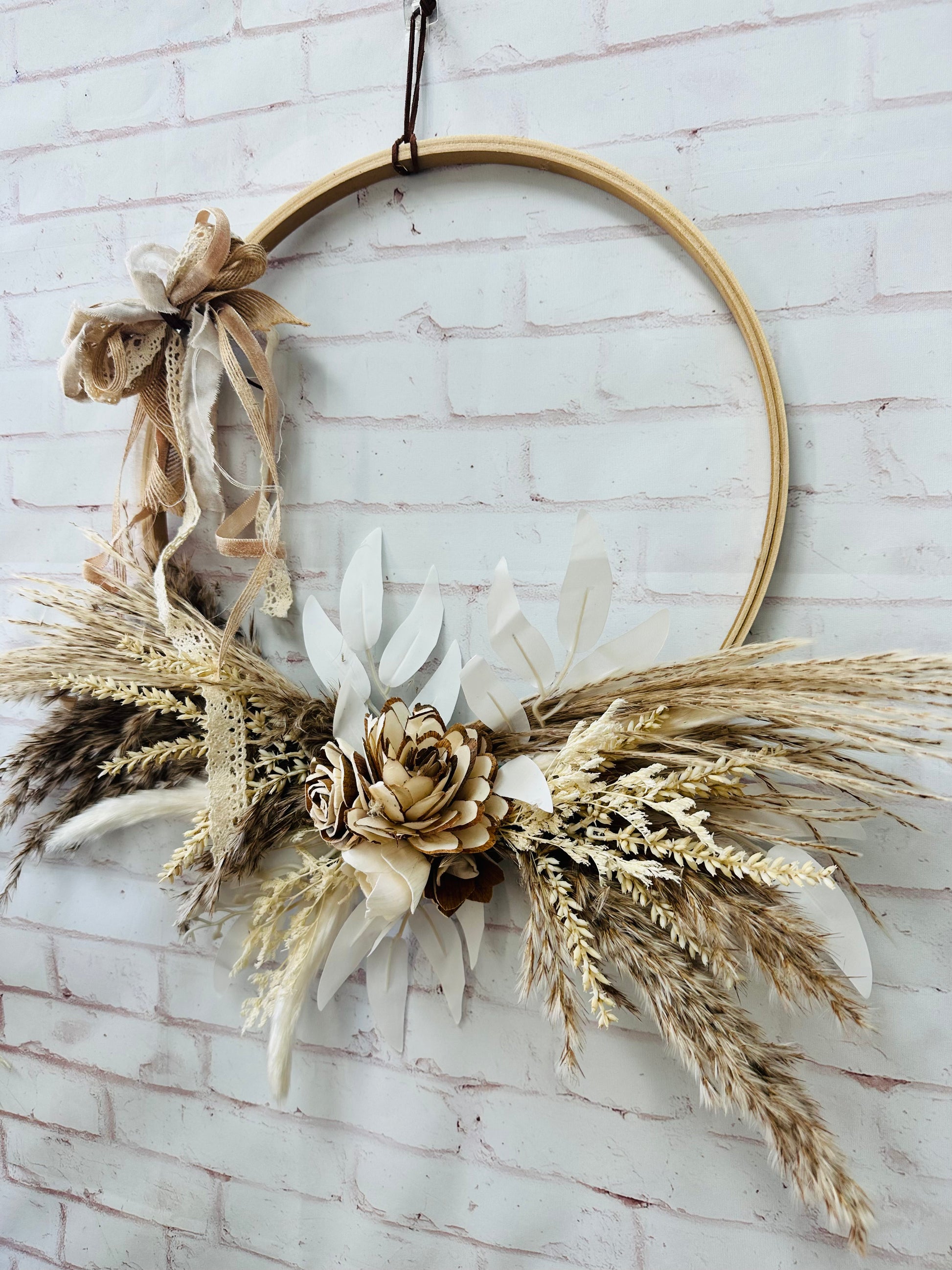 Wreath measures 13inches and features natural greenery and faux wooden flowers. Handmade rag bow attached.