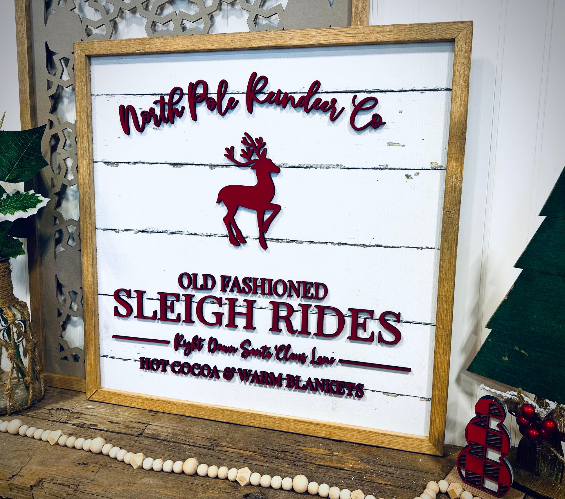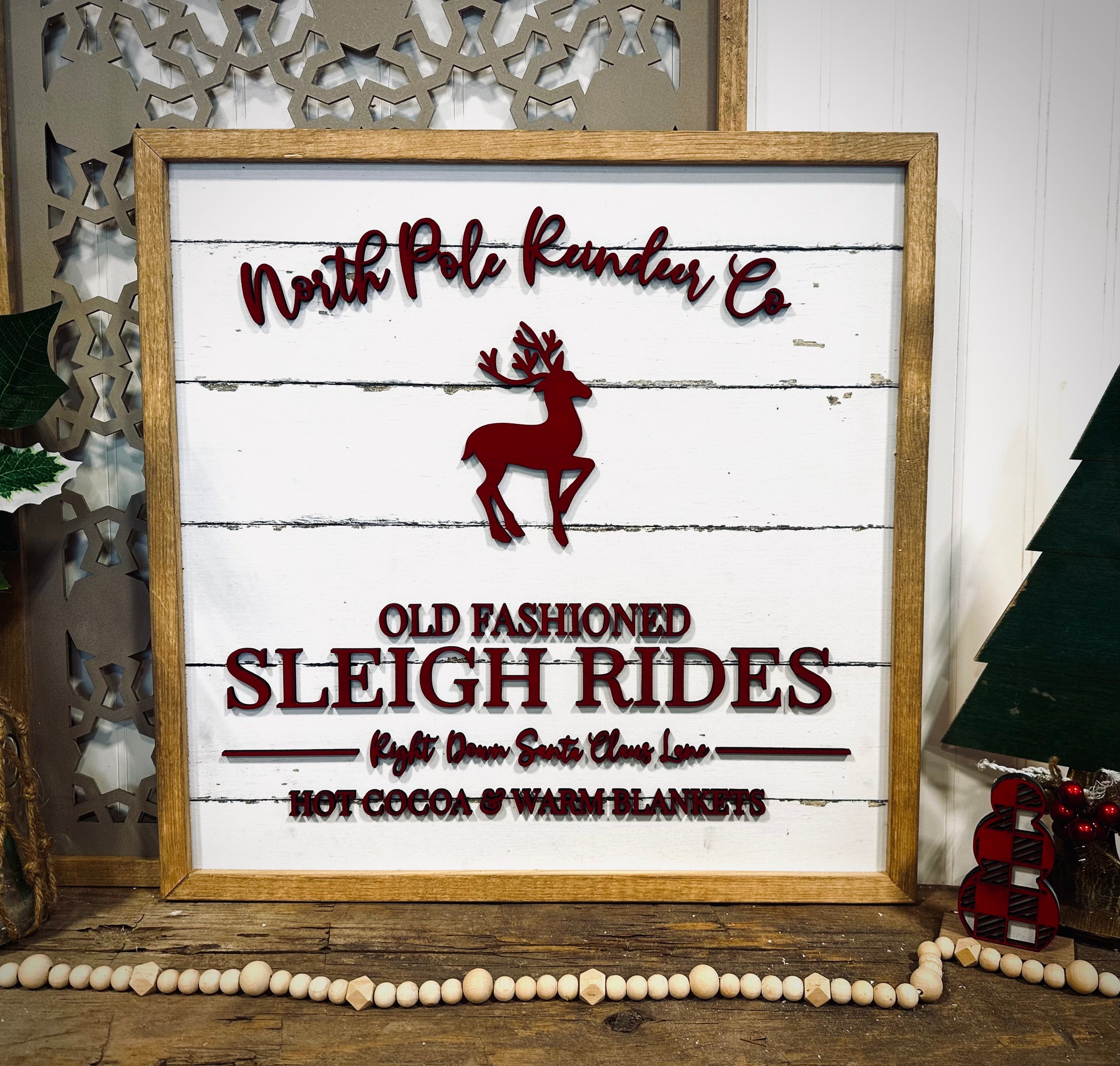 North Pole old fashioned sleigh rides framed sign- white canvas background