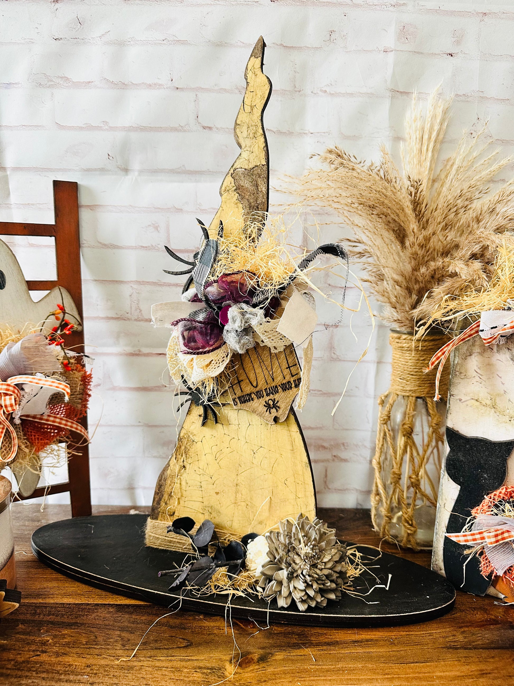 hat comes with wooden spiders attached and bow and flower. Flowers may vary slightly depending on inventory. Colors will remain the same.