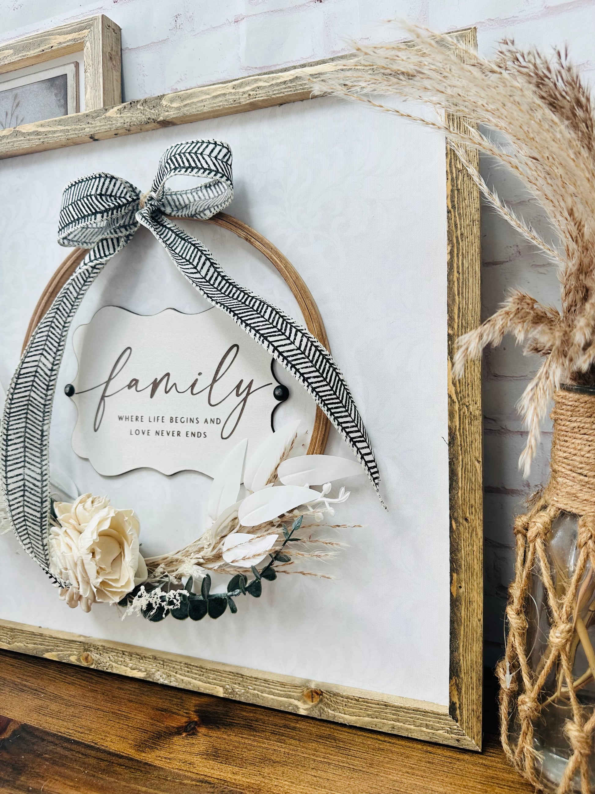 wooden hoop is attached with a bow and boho style greenery and wood flowers
