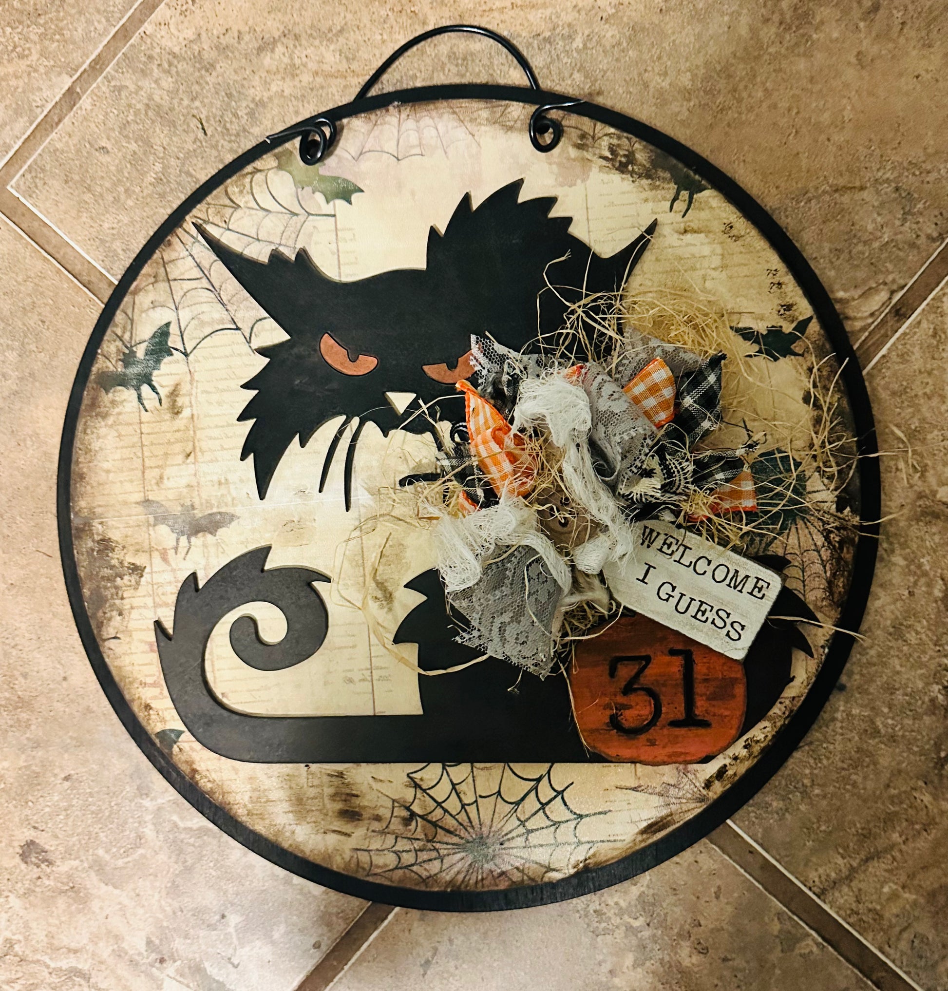 This sign features a black background with a vintage Halloween printed top layer. Edges are hand distressed.