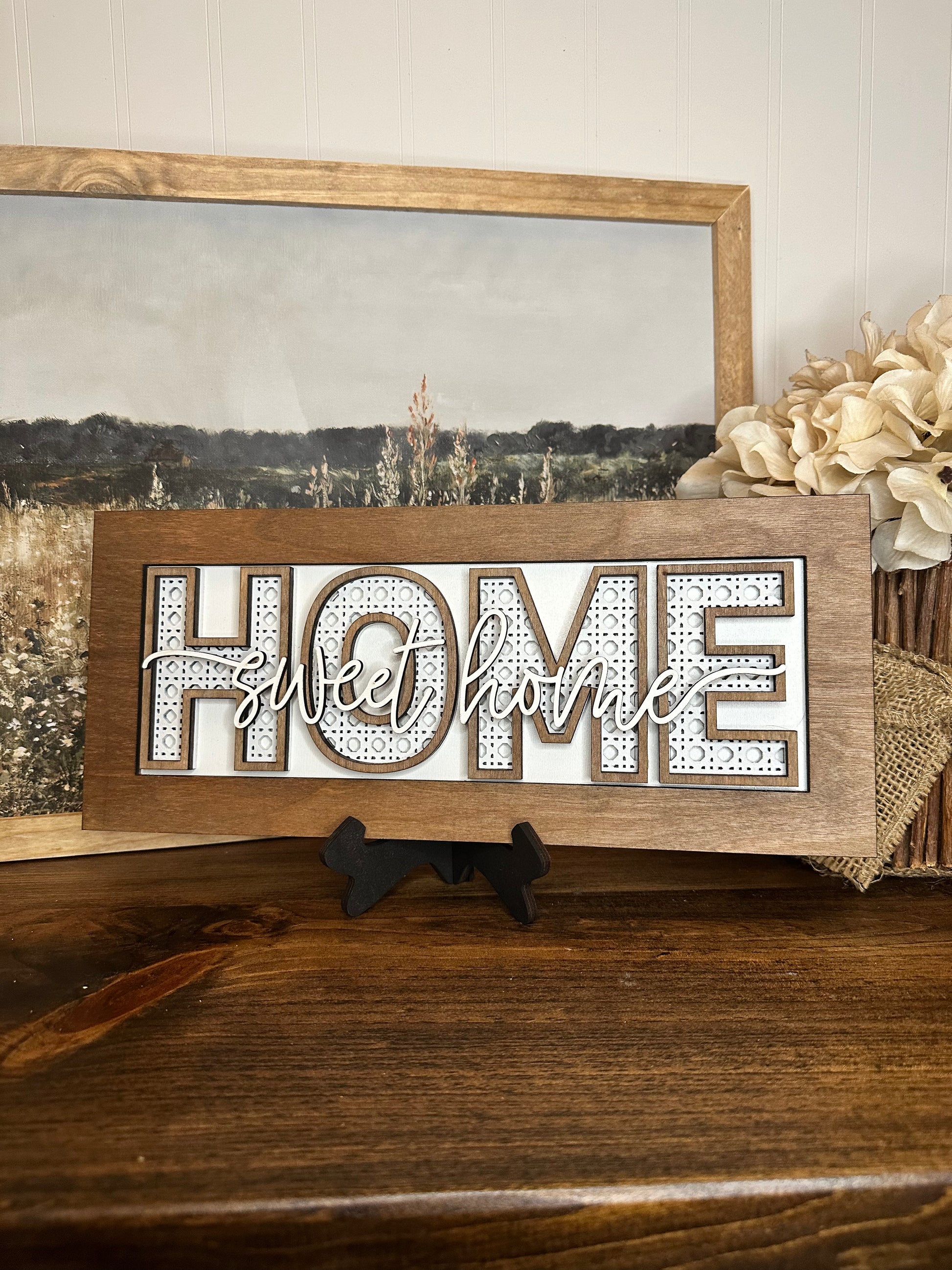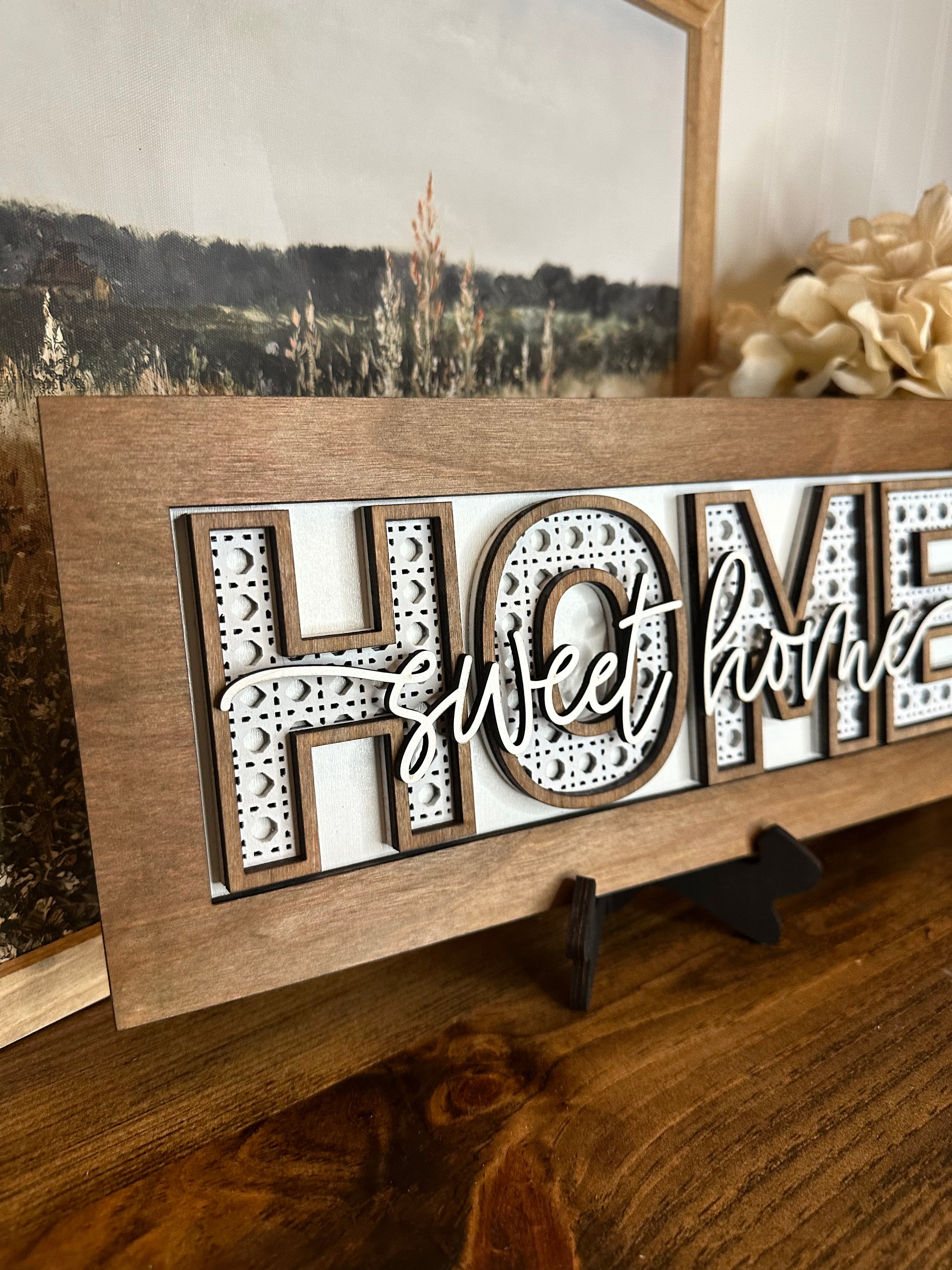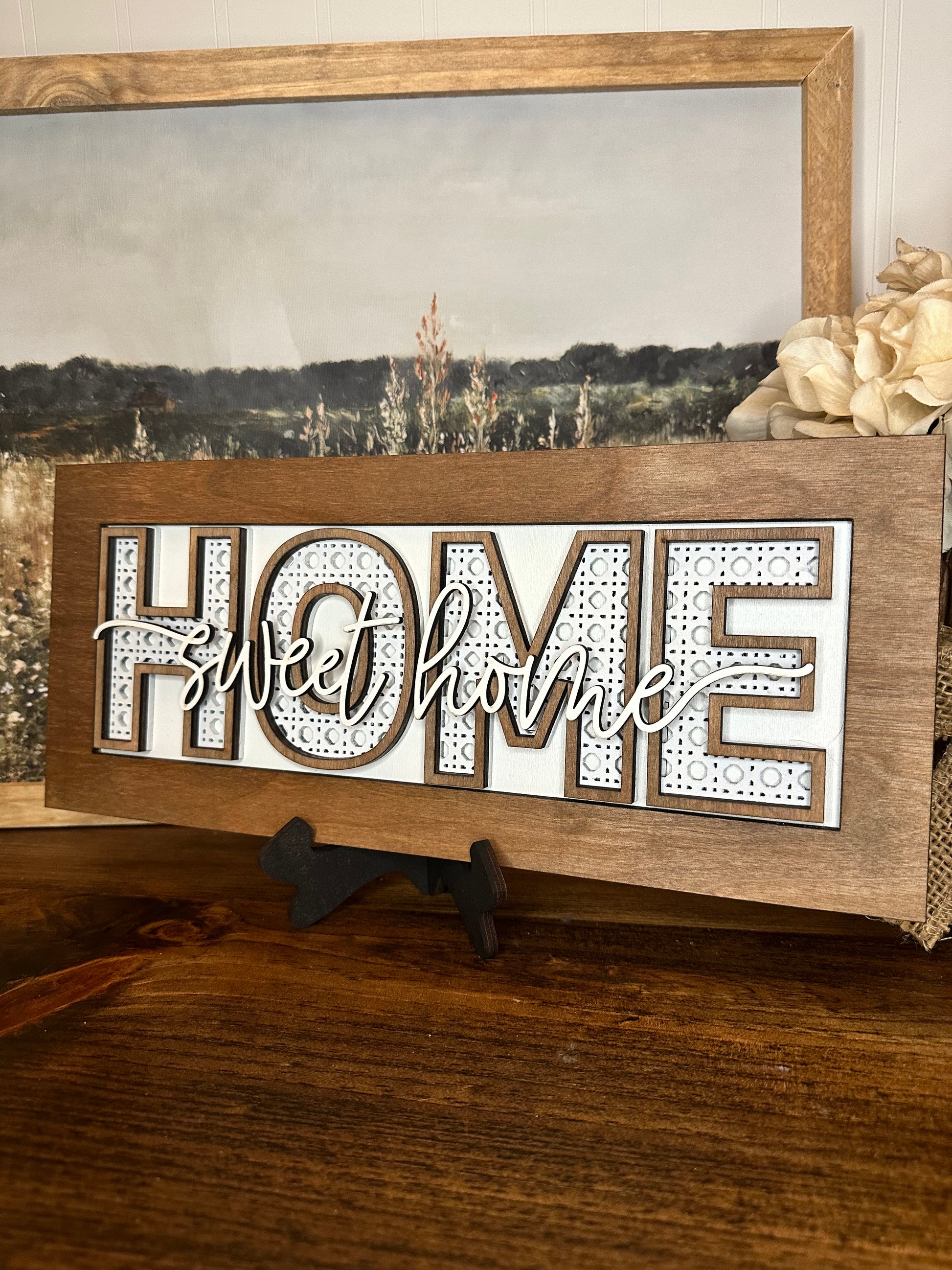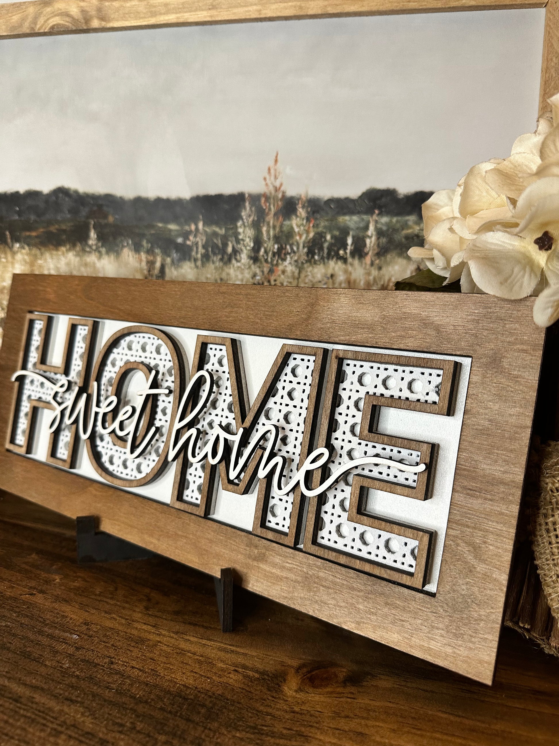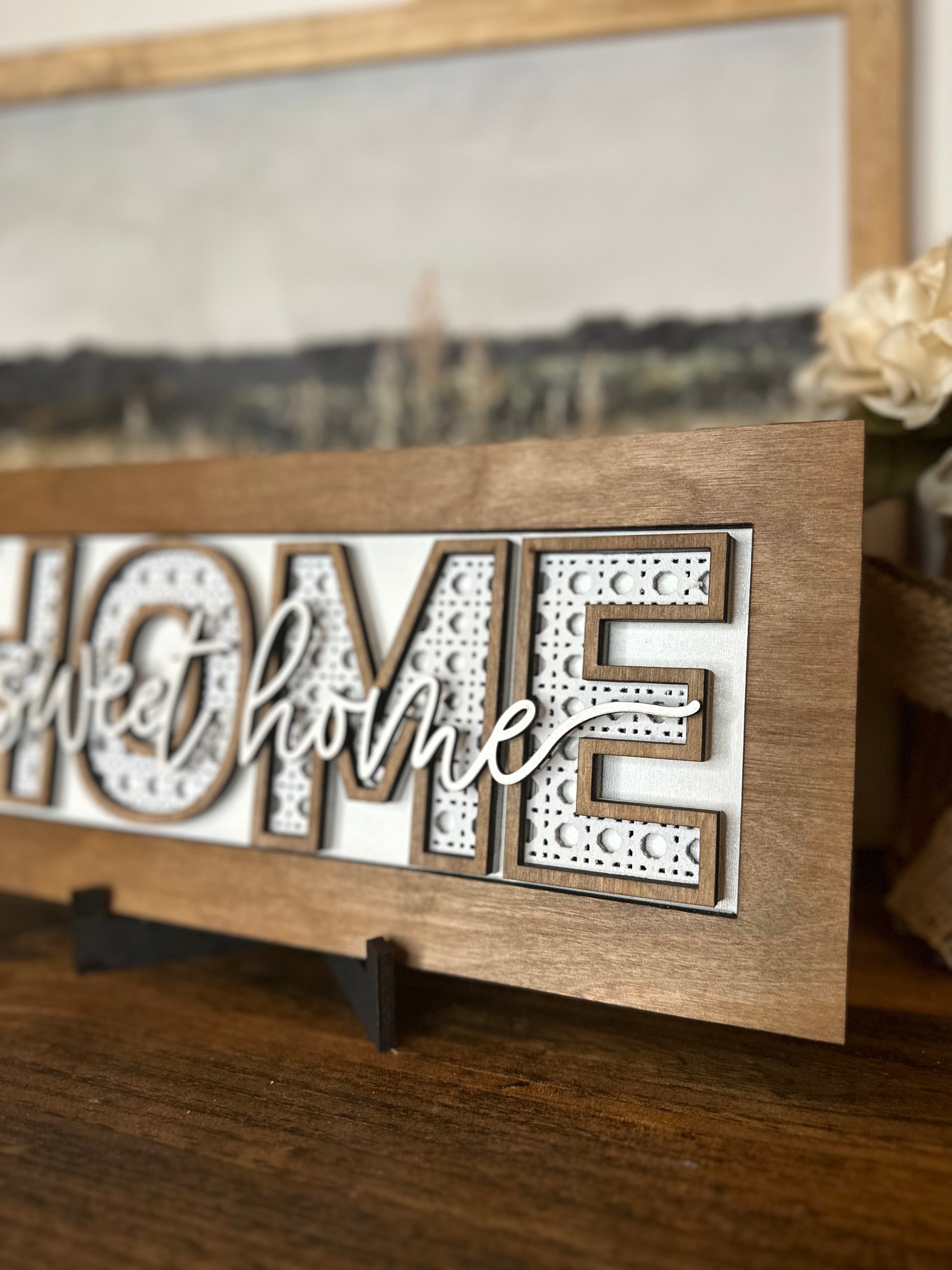 This sign is layered a layered laser cut sign with a boho rattan pattern cut into the letters.