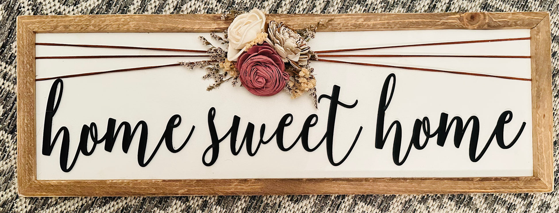 Boho home sweet home framed wood sign. Sign measures 24x9 and features a light wood distressed frame. Frame is 1inch thick.