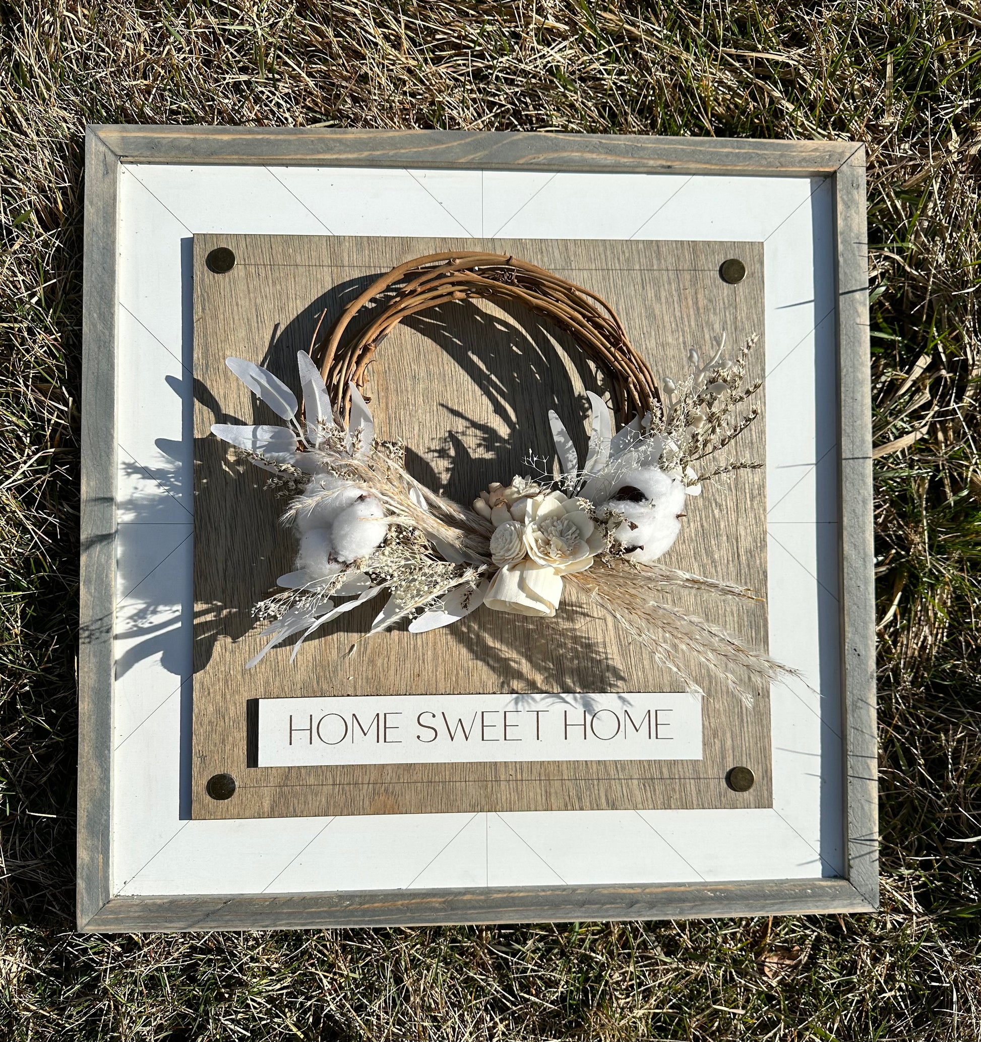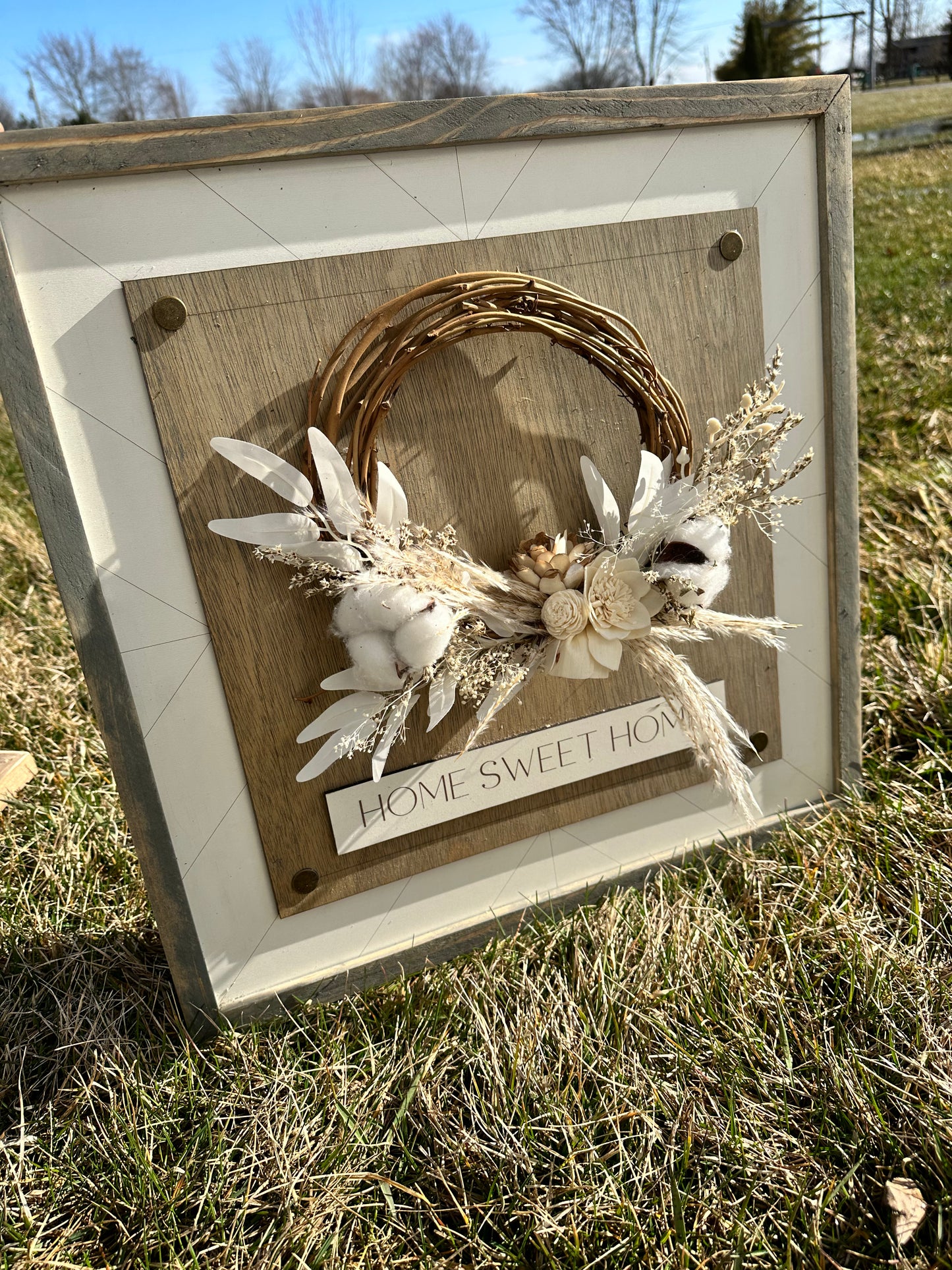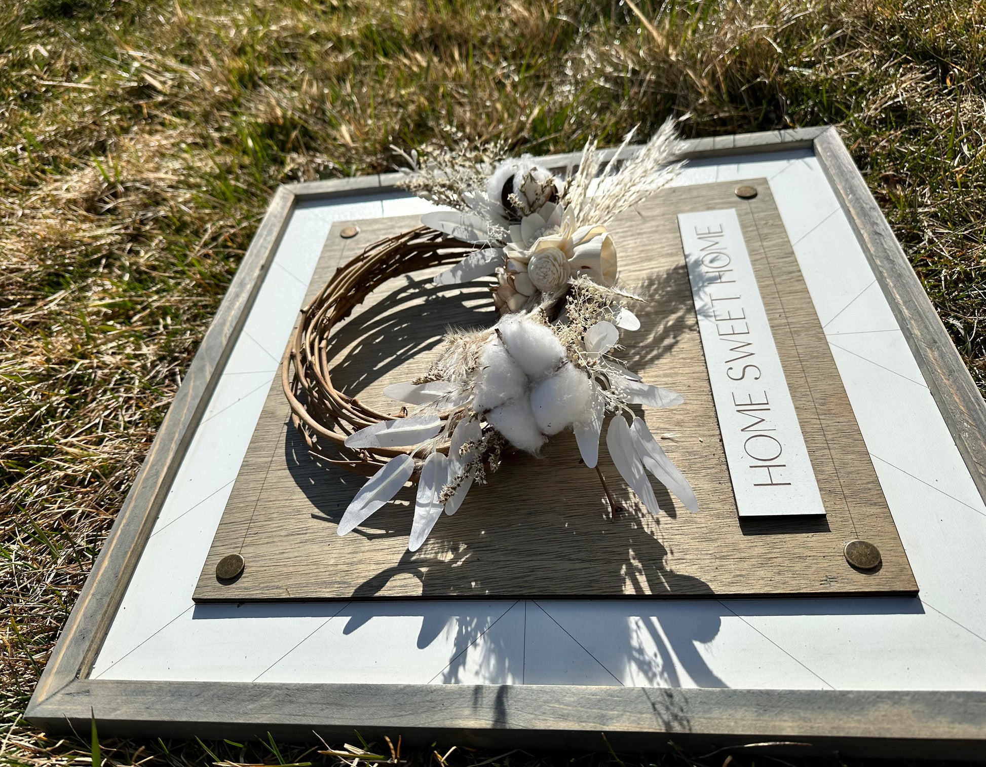 This boho style sign is stained grey and features engraved lettering into the white board. Grapevine wreath is handmade and has a boho feel. Faux greenery and wood flowers are used on this wreath. Flowers are soft and dainty and are made to last. Please note flowers may vary slightly due to inventory but size, color and amount of flowers used will remain consistent