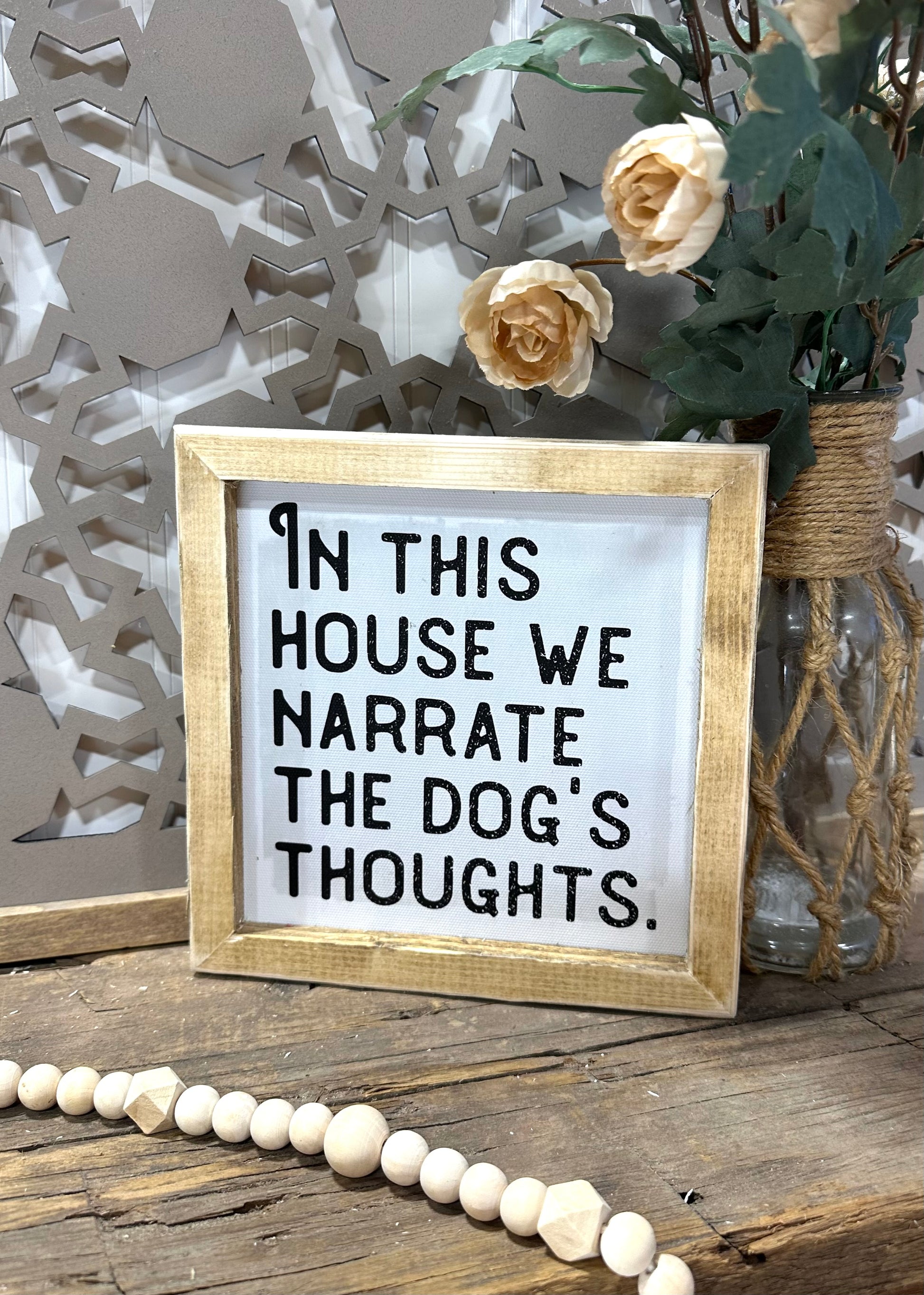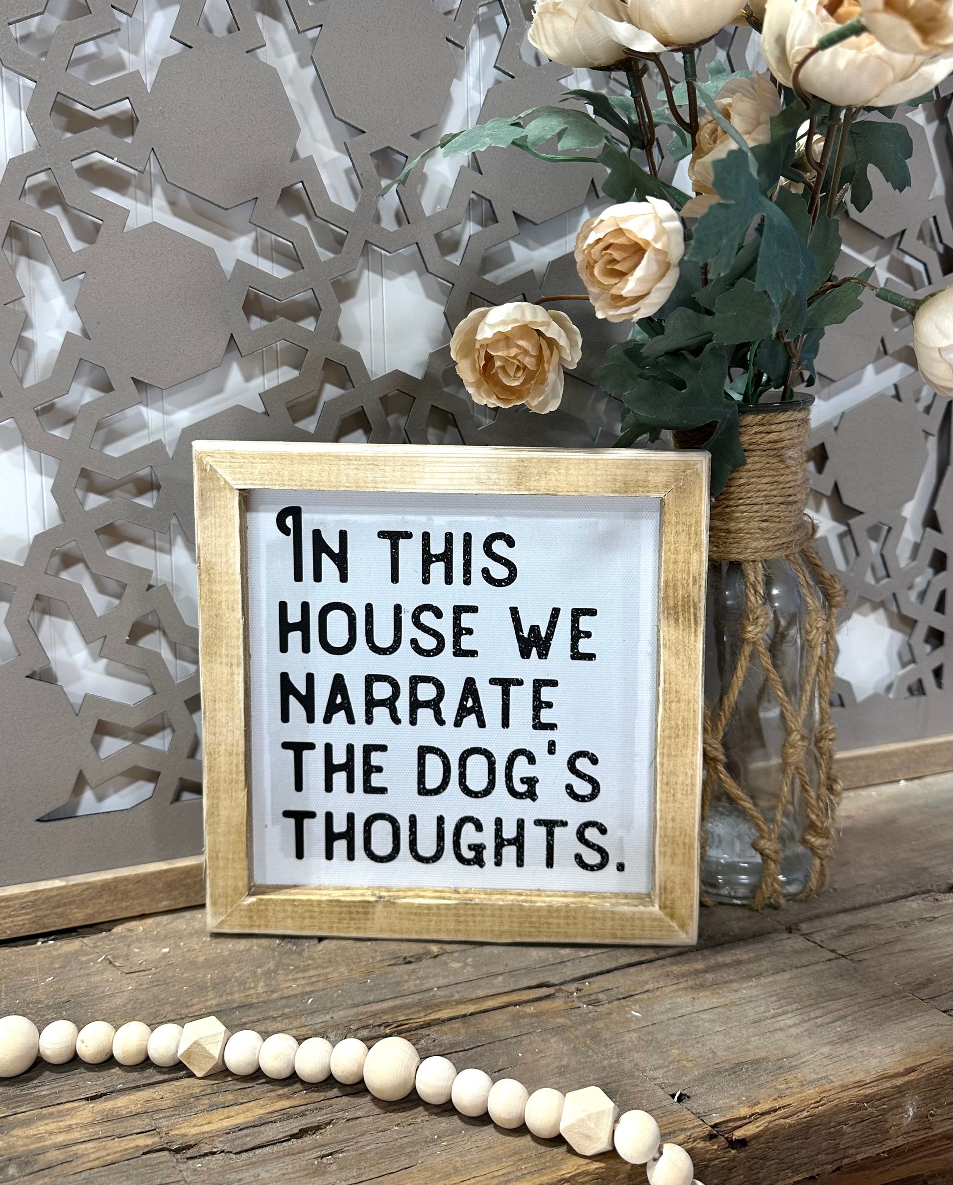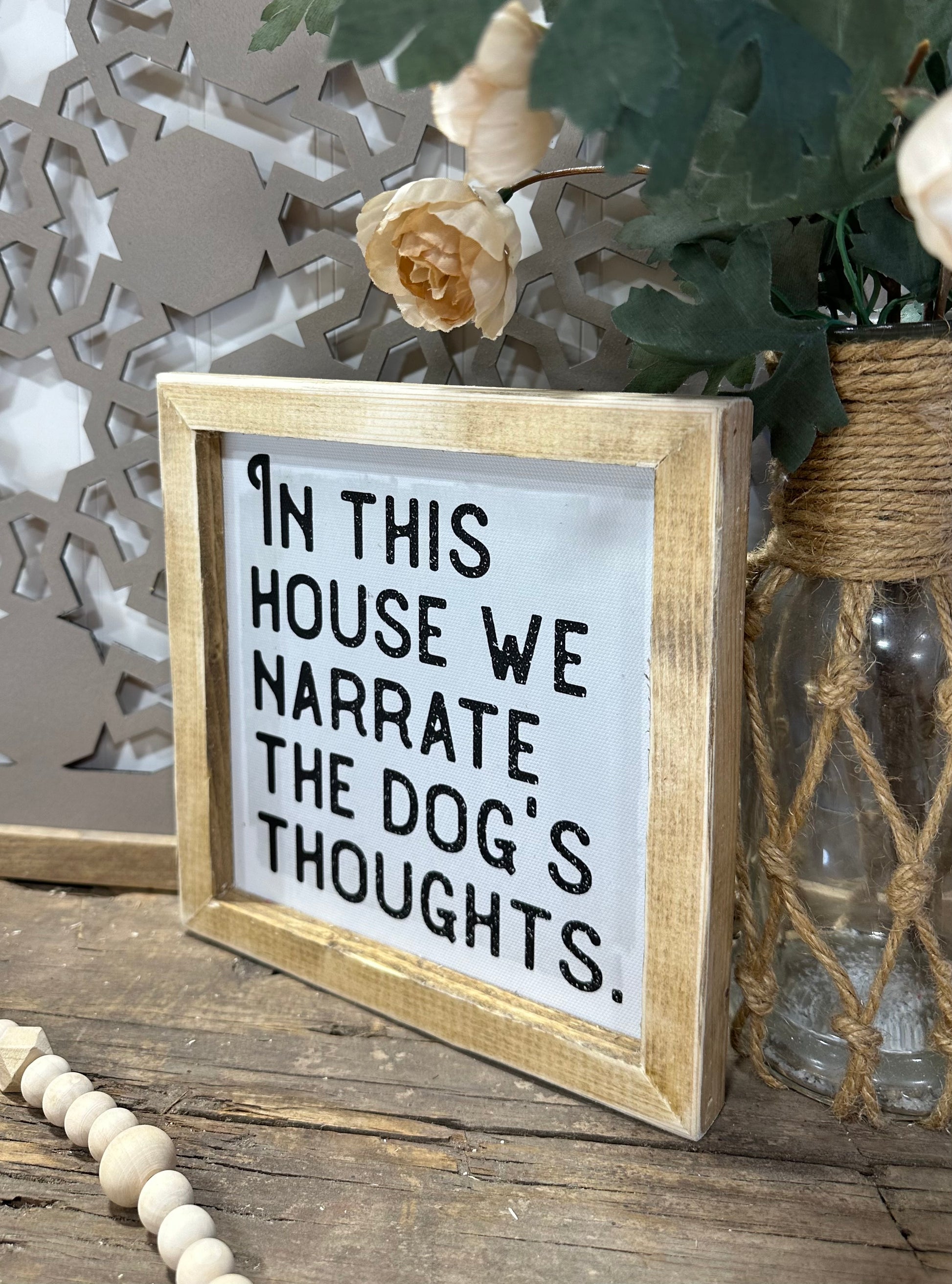 I’m this house we narrate the dogs thoughts mini wooden framed canvas sign