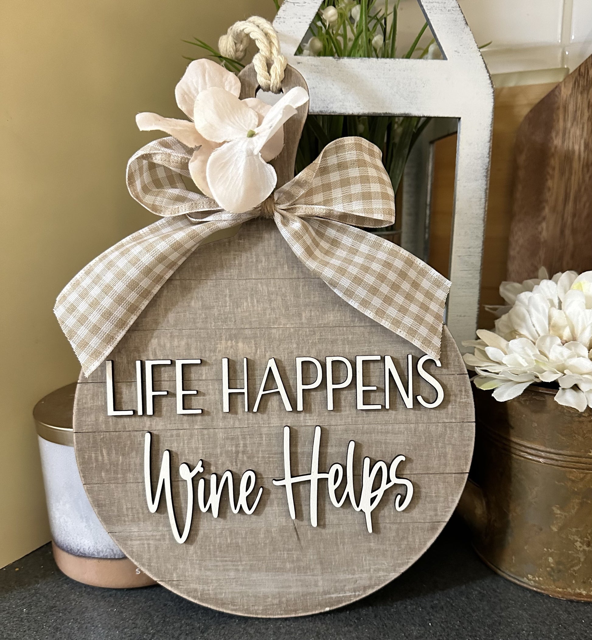This sign comes in a light grey stain with a light white washing over the top to give a rustic look. This item features wood cut 3D lettering. The faux cutting board comes with a tan and white gingham style bow and matching flower, there is a jute cord attached to the end of the cutting board for easy hanging or this piece can be displayed using an easel or leaning up against something. This item will not stand on its own.