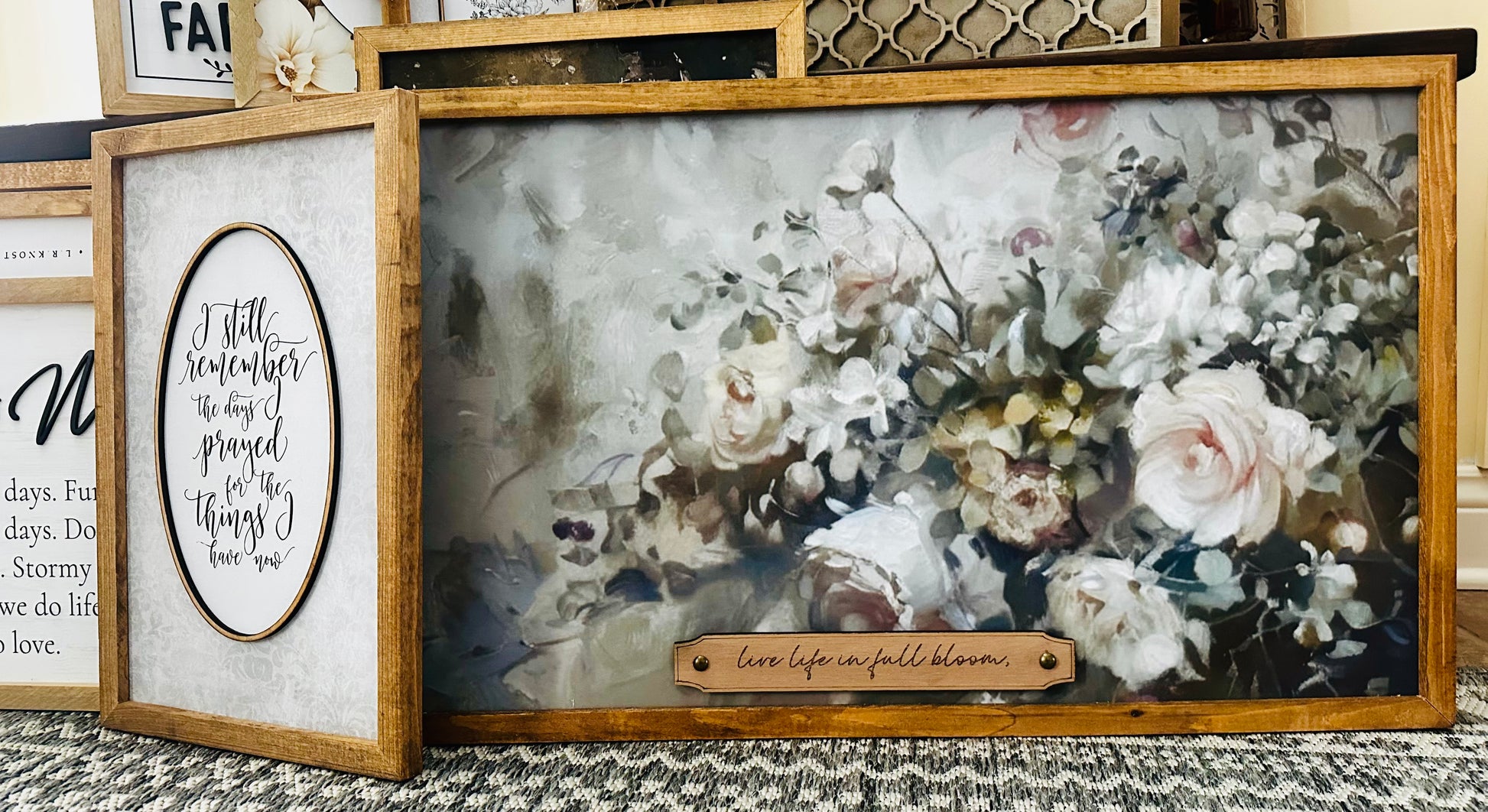 Offered in several sizes and framed in 1 inch medium special walnut stained frame.