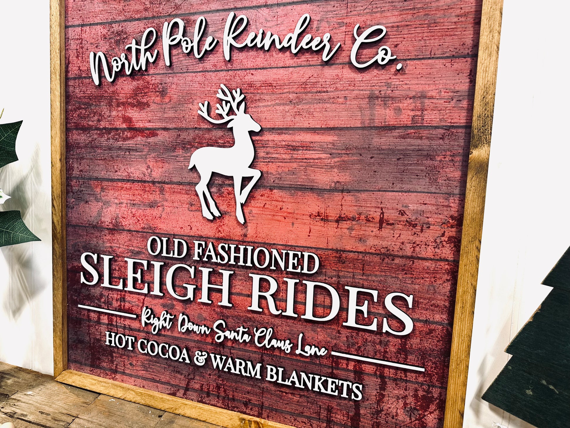 North Pole old fashioned sleigh rides framed sign- Red canvas background