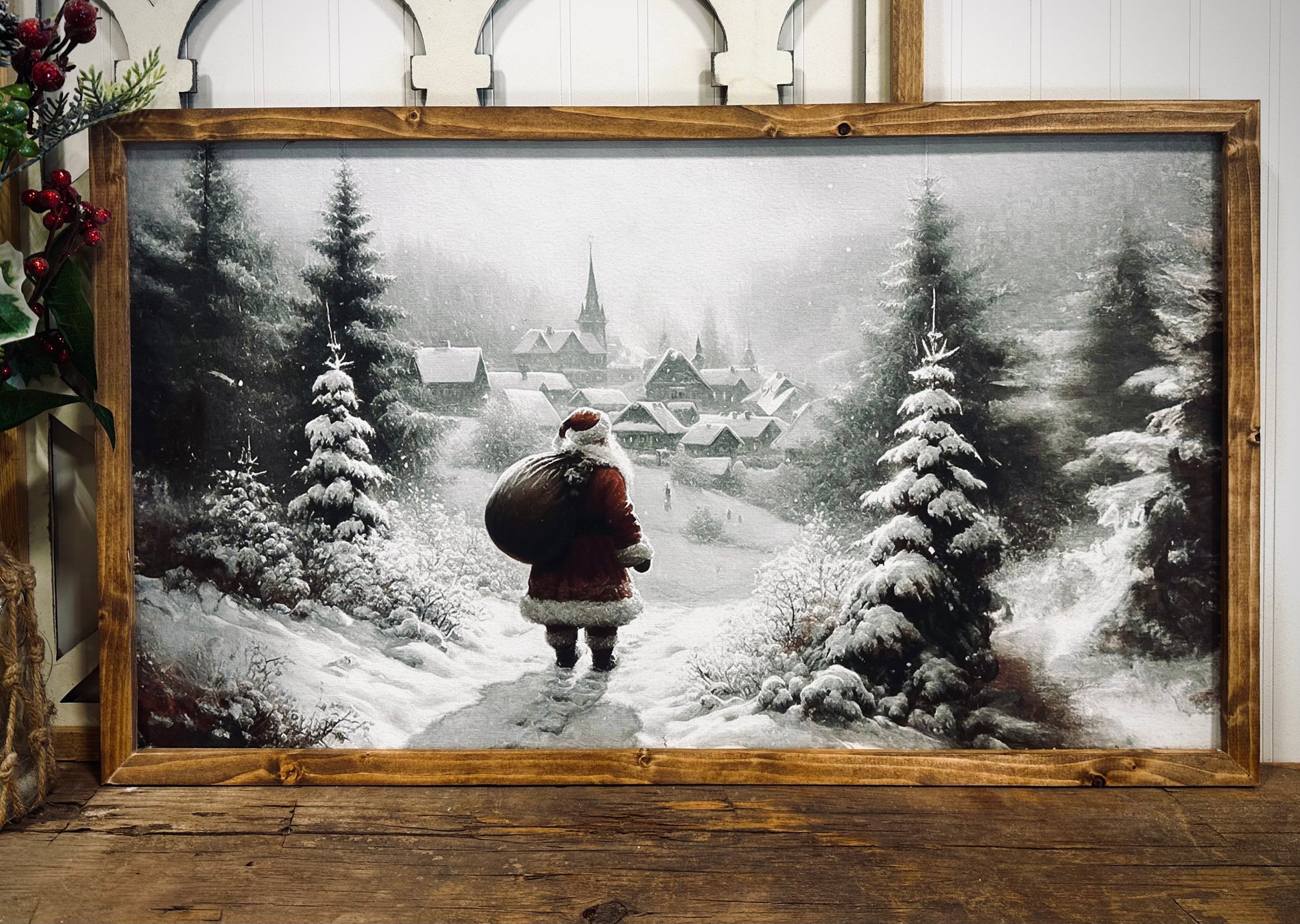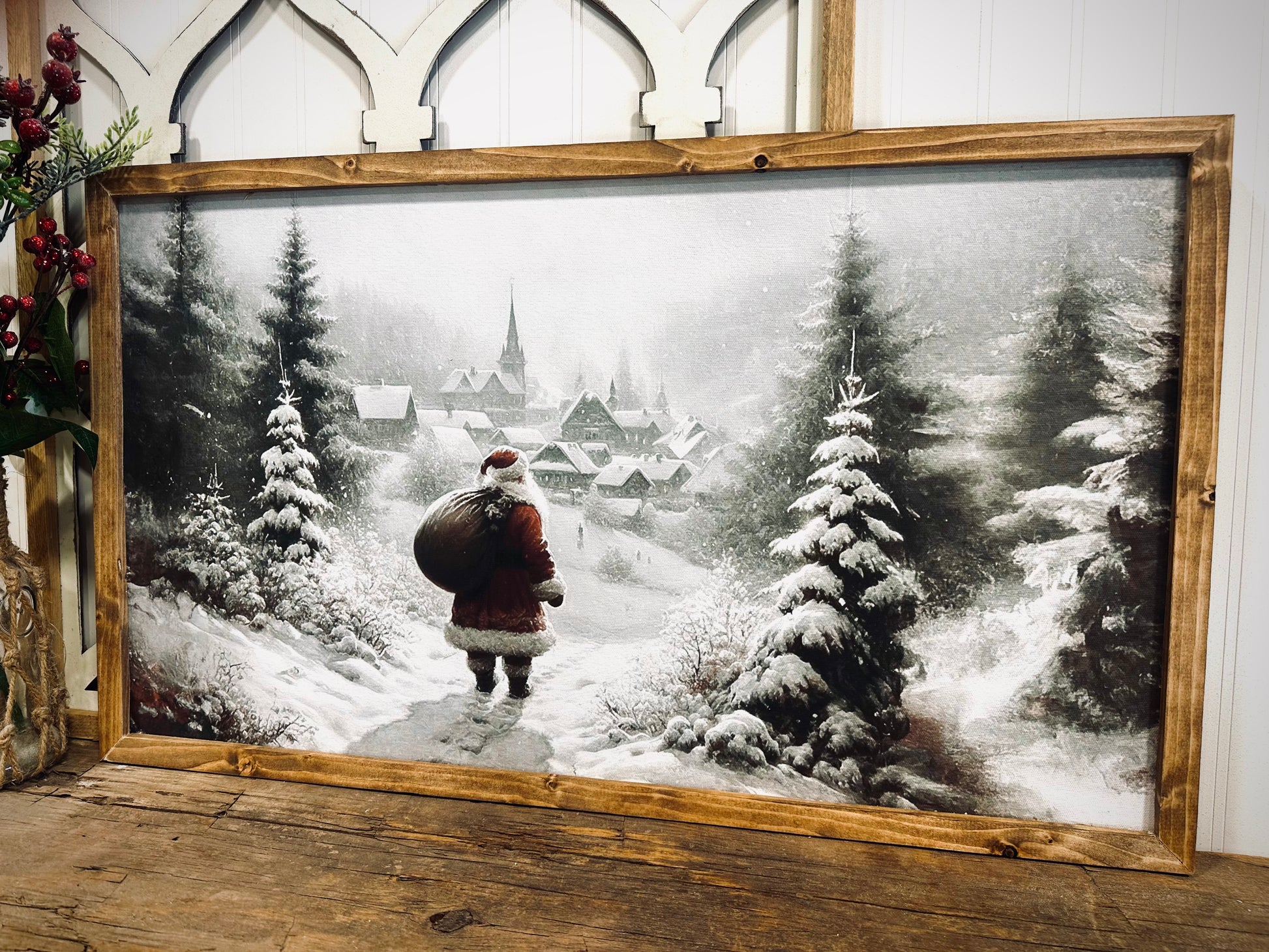Santa looking over village snowy winter scene wood framed canvas Christmas print