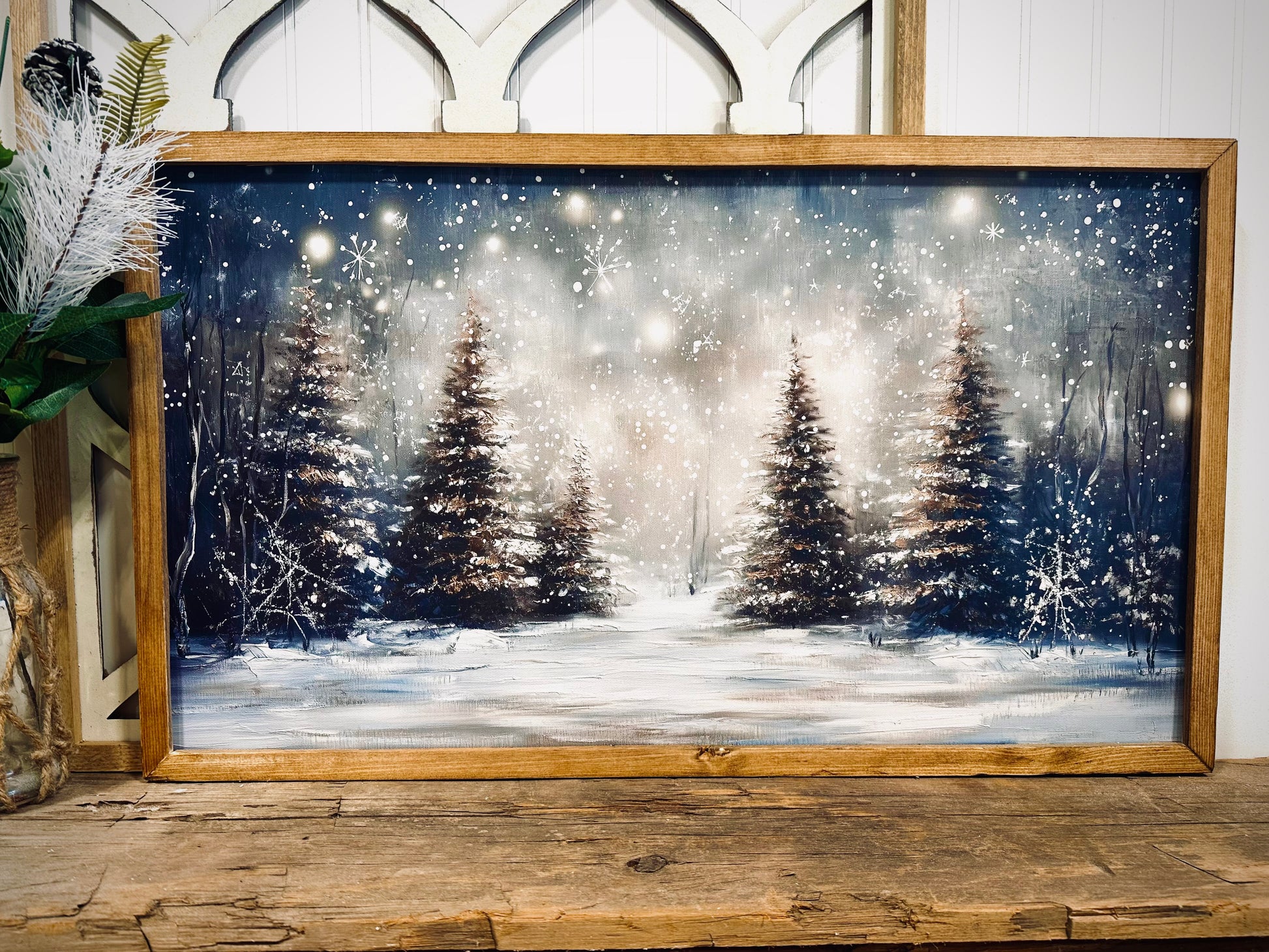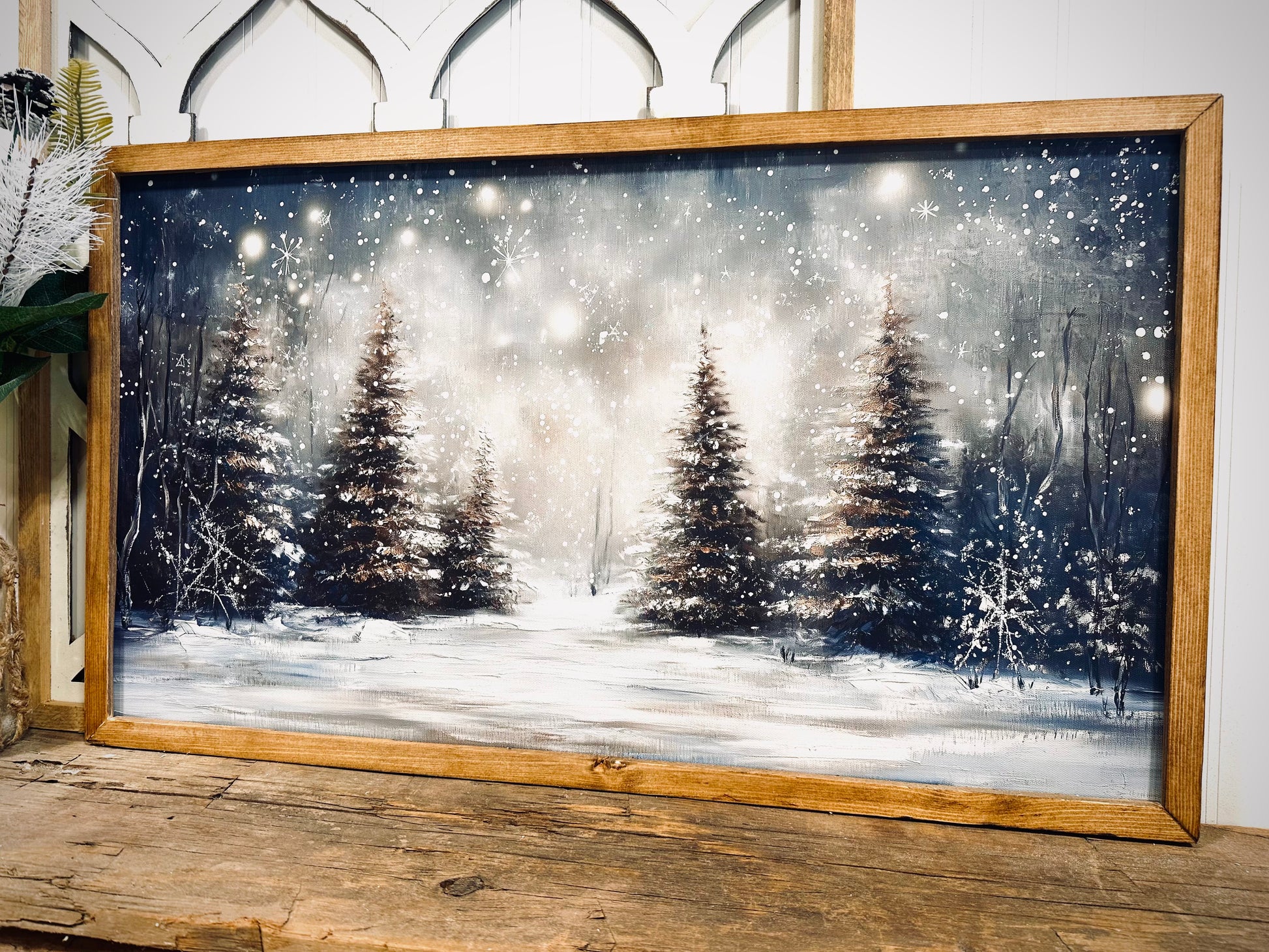 Snow covered winter trees wood framed Christmas canvas print