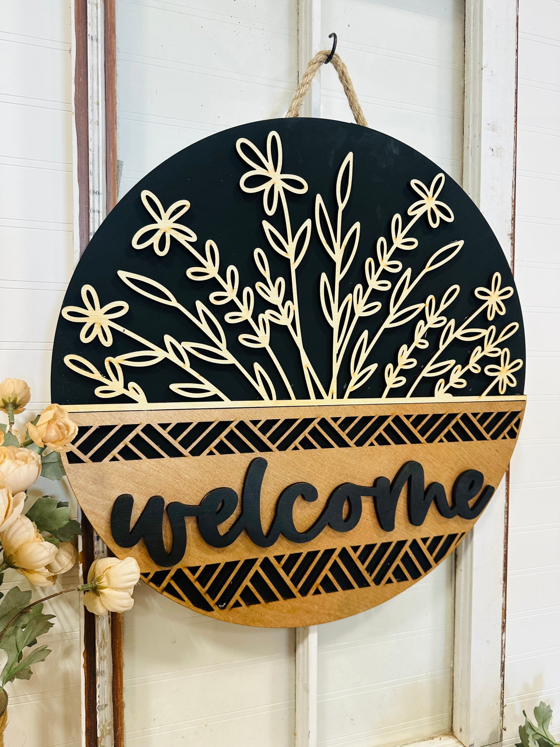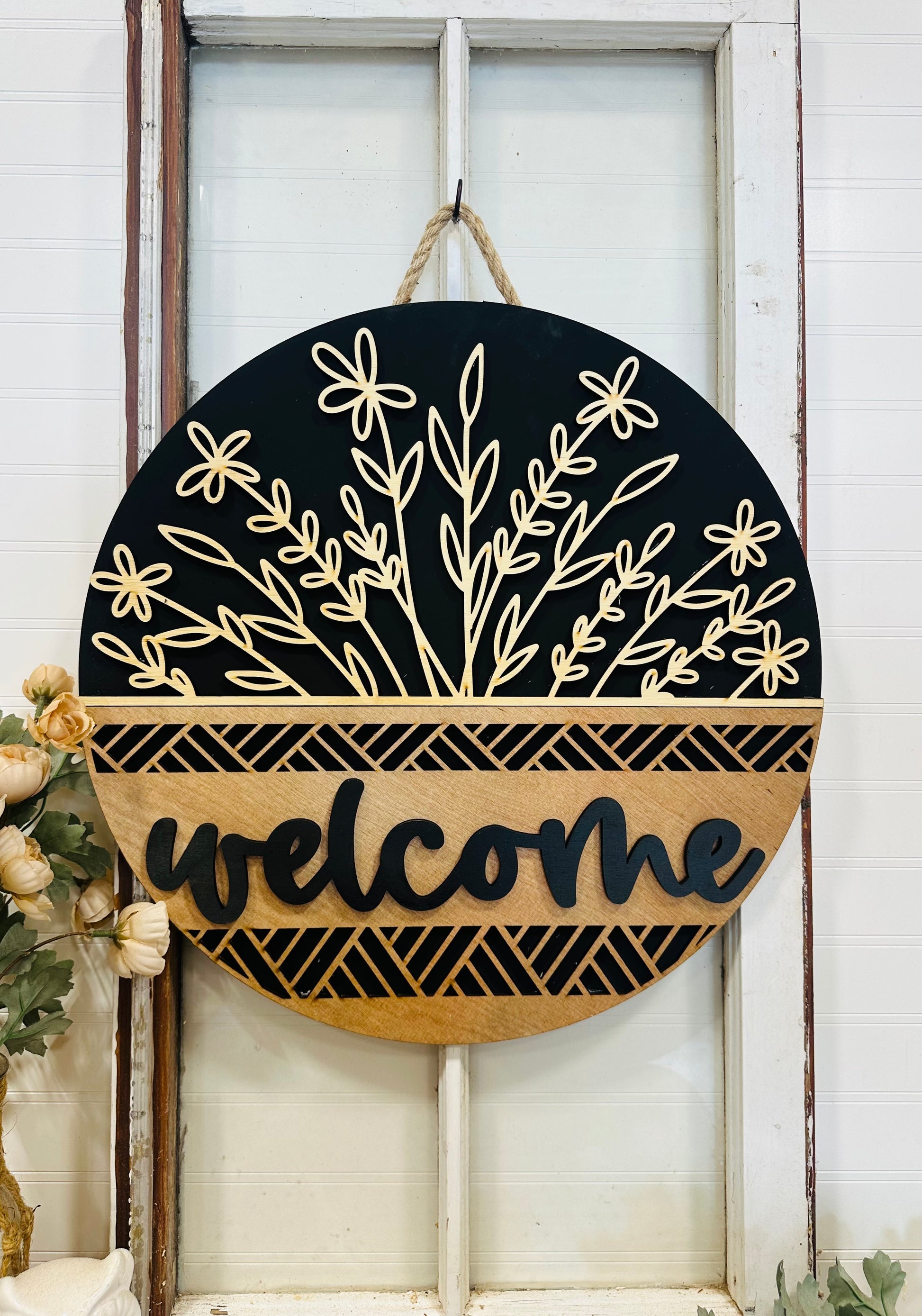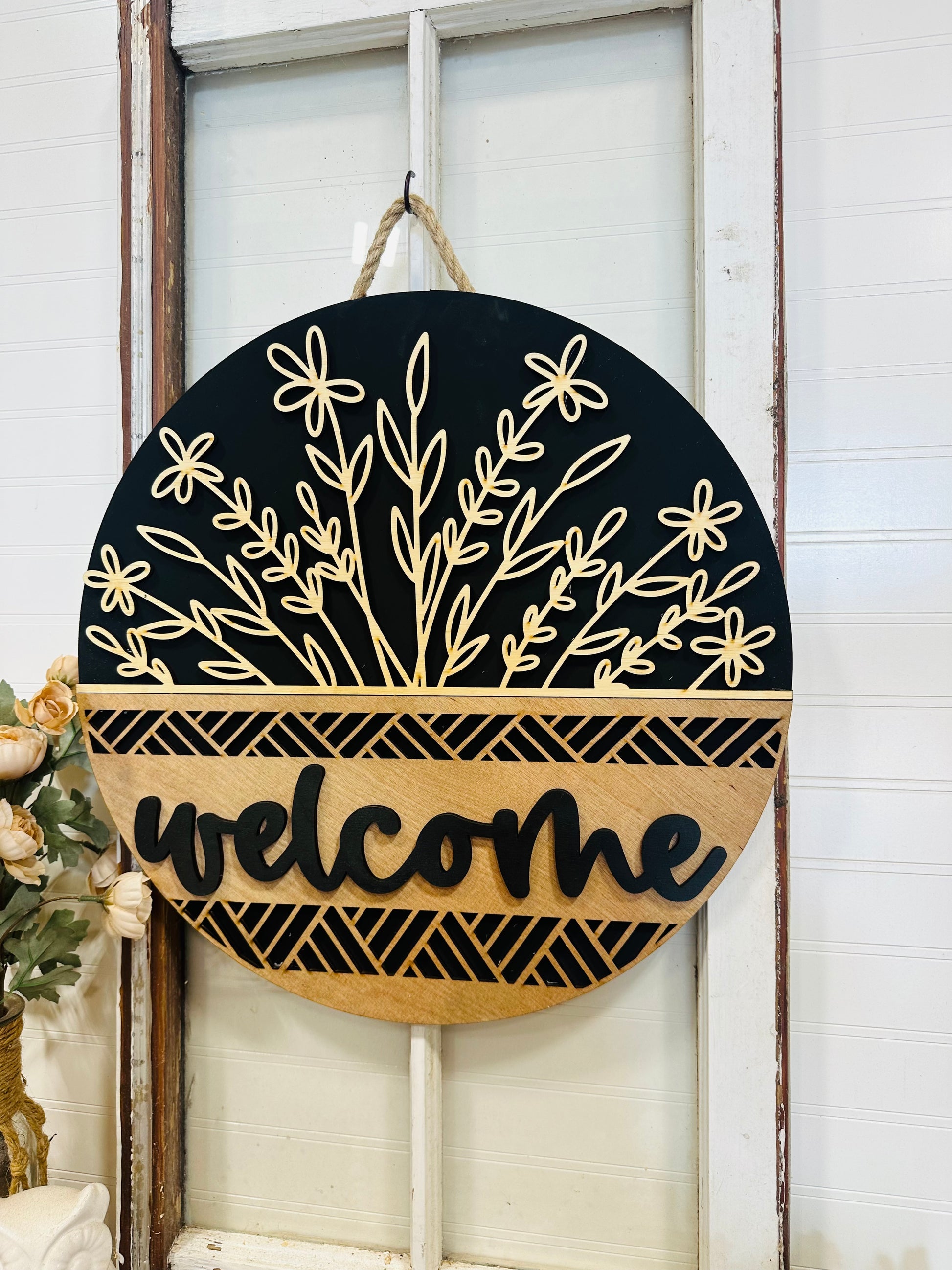 Welcome Floral wood door wreath - BLACK