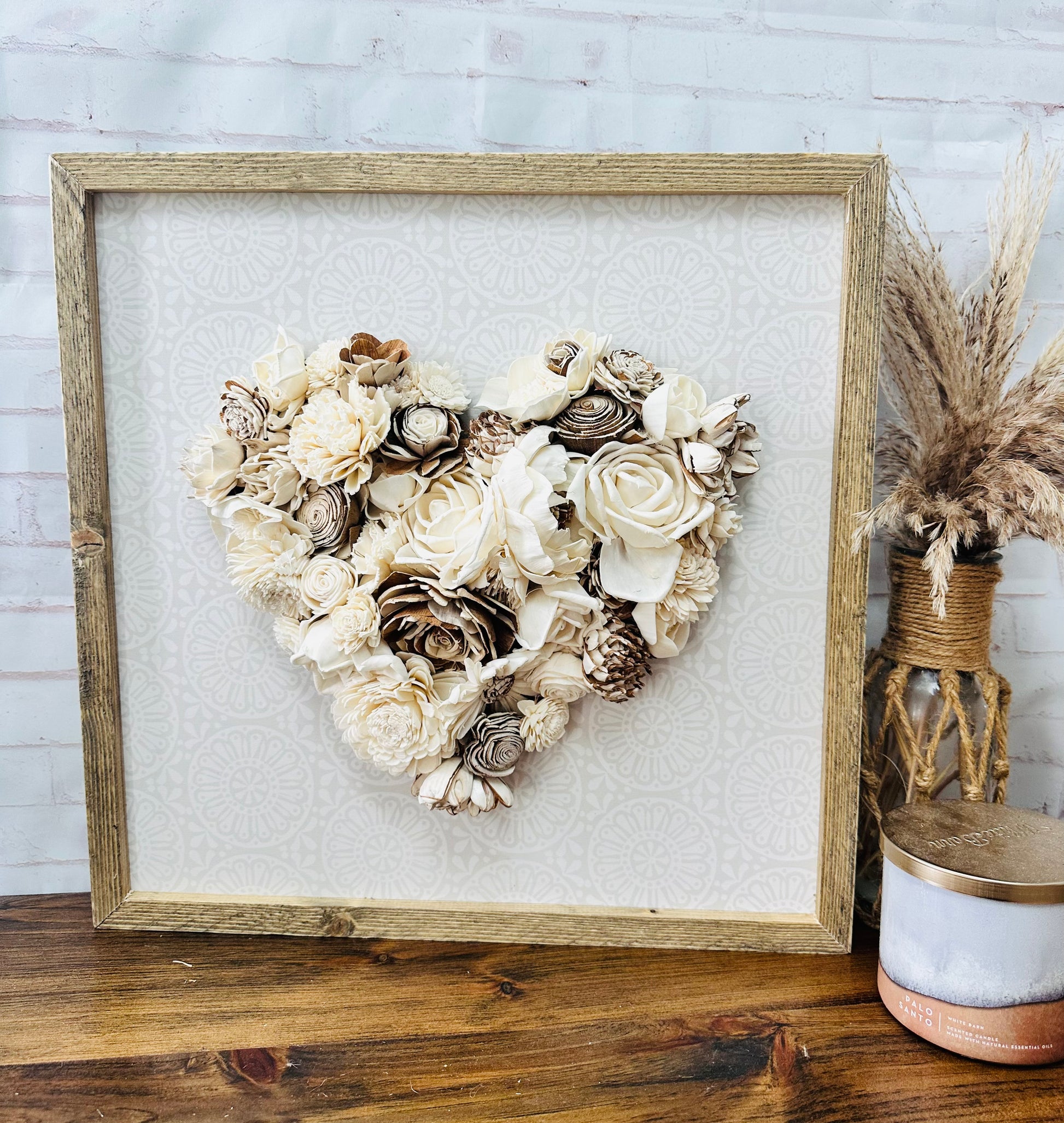 heart is handmade with wood flowers attached. Truly a delicate and beautiful piece!